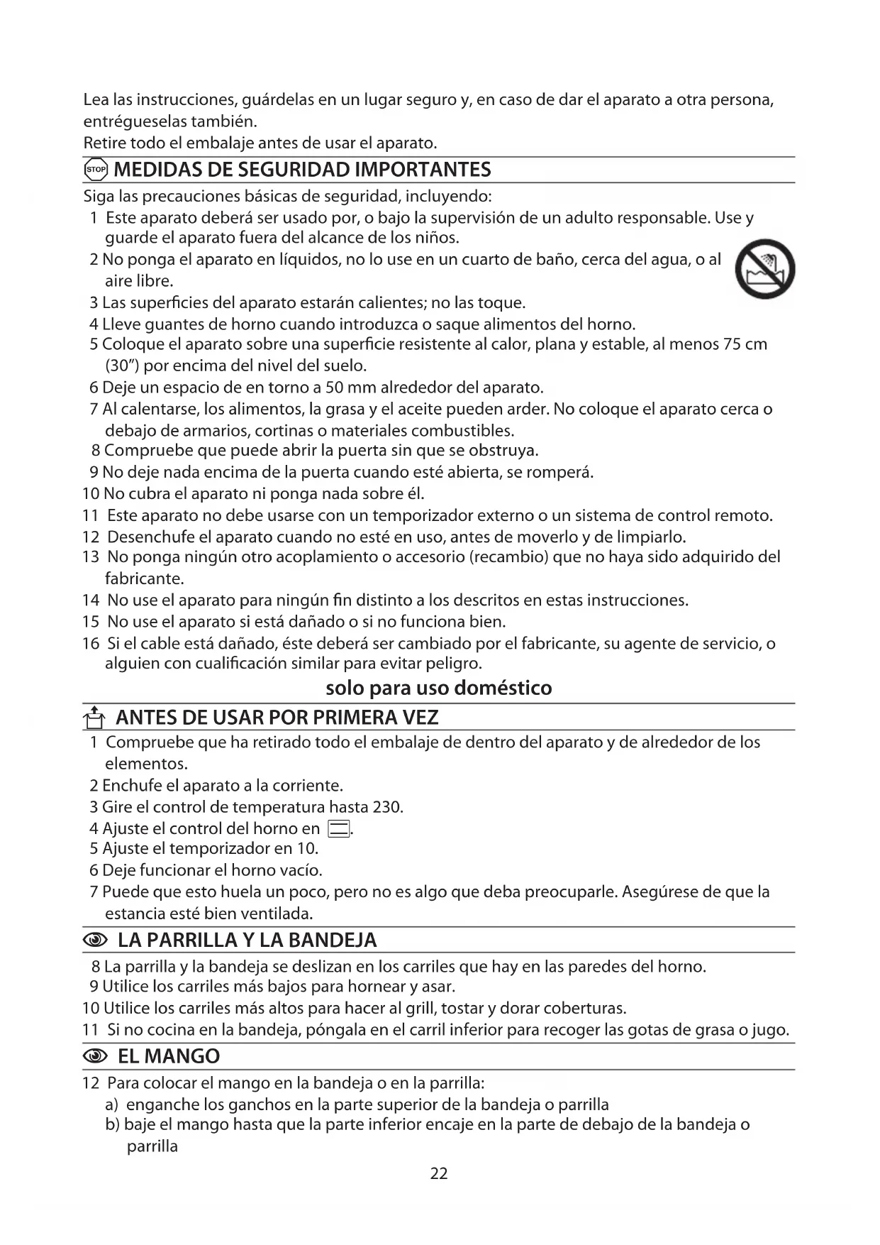 Siga las precauciones básicas de seguridad, incluyendo: 1 Este aparato deberá ser usado por, o bajo la supervisión de un adulto responsable. Use y guarde el aparato fuera del alcance de los niños. 2 No ponga el aparato en líquidos, no lo use en un cuarto de baño, cerca del agua, o al aire libre. 3 Las superficies del aparato estarán calientes; no las toque. 4 Lleve guantes de horno cuando introduzca o saque alimentos del horno. 5 Coloque el aparato sobre una superficie resistente al calor, plana y estable, al menos 75 cm (30”) por encima del nivel del suelo. 6 Deje un espacio de en torno a 50 mm alrededor del aparato. 7 Al calentarse, los alimentos, la grasa y el aceite pueden arder. No coloque el aparato cerca o debajo de armarios, cortinas o materiales combustibles. 8 Compruebe que puede abrir la puerta sin que se obstruya. 9 No deje nada encima de la puerta cuando esté abierta, se romperá. 10 No cubra el aparato ni ponga nada sobre él. 11 Este aparato no debe usarse con un temporizador externo o un sistema de control remoto. 12 Desenchufe el aparato cuando no esté en uso, antes de moverlo y de limpiarlo. 13 No ponga ningún otro acoplamiento o accesorio (recambio) que no haya sido adquirido del fabricante. 14 No use el aparato para ningún fin distinto a los descritos en estas instrucciones. 15 No use el aparato si está dañado o si no funciona bien. 16 Si el cable está dañado, éste deberá ser cambiado por el fabricante, su agente de servicio, o alguien con cualificación similar para evitar peligro. solo para uso doméstico U ANTES DE USAR POR PRIMERA VEZ 1 Compruebe que ha retirado todo el embalaje de dentro del aparato y de alrededor de los elementos. 2 Enchufe el aparato a la corriente. 3 Gire el control de temperatura hasta 230. 4 Ajuste el control del horno en H. 5 Ajuste el temporizador en 10. 6 Deje funcionar el horno vacío. 7 Puede que esto huela un poco, pero no es algo que deba preocuparle. Asegúrese de que la estancia esté bien ventilada.