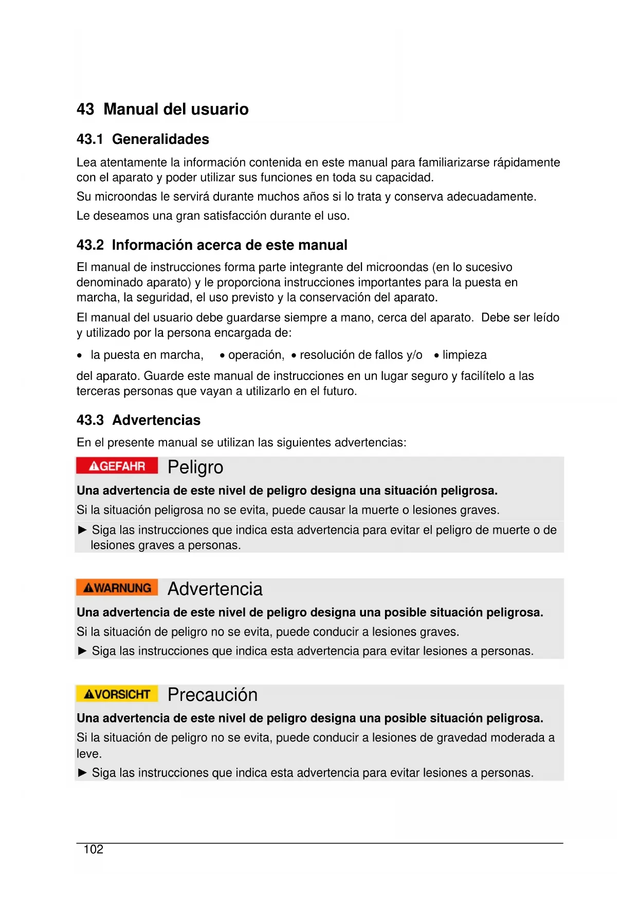 En el presente manual se utilizan las siguientes advertencias: Peligro Una advertencia de este nivel de peligro designa una situación peligrosa. Si la situación peligrosa no se evita, puede causar la muerte o lesiones graves. ► Siga las instrucciones que indica esta advertencia para evitar el peligro de muerte o de lesiones graves a personas. Advertencia Una advertencia de este nivel de peligro designa una posible situación peligrosa. Si la situación de peligro no se evita, puede conducir a lesiones graves. ► Siga las instrucciones que indica esta advertencia para evitar lesiones a personas. Precaución Una advertencia de este nivel de peligro designa una posible situación peligrosa. Si la situación de peligro no se evita, puede conducir a lesiones de gravedad moderada a leve. ► Siga las instrucciones que indica esta advertencia para evitar lesiones a personas.103 Nota Esta indicación designa información adicional que facilitará el manejo del aparato.