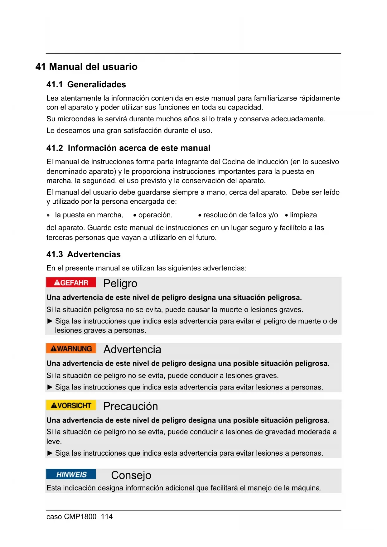 En el presente manual se utilizan las siguientes advertencias: Peligro Una advertencia de este nivel de peligro designa una situación peligrosa. Si la situación peligrosa no se evita, puede causar la muerte o lesiones graves. ► Siga las instrucciones que indica esta advertencia para evitar el peligro de muerte o de lesiones graves a personas. Advertencia Una advertencia de este nivel de peligro designa una posible situación peligrosa. Si la situación de peligro no se evita, puede conducir a lesiones graves. ► Siga las instrucciones que indica esta advertencia para evitar lesiones a personas. Precaución Una advertencia de este nivel de peligro designa una posible situación peligrosa. Si la situación de peligro no se evita, puede conducir a lesiones de gravedad moderada a leve. ► Siga las instrucciones que indica esta advertencia para evitar lesiones a personas. Consejo Esta indicación designa información adicional que facilitará el manejo de la máquina.caso CMP1800 115