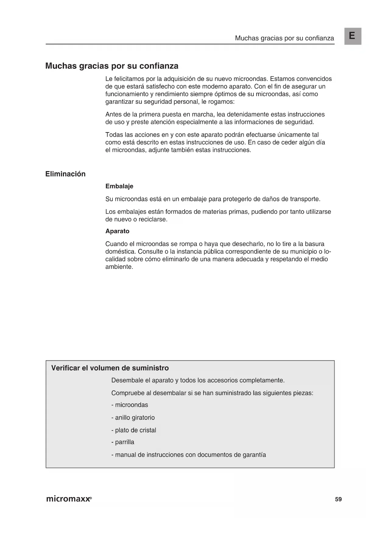Muchas gracias por su confianza Le felicitamos por la adquisición de su nuevo microondas. Estamos convencidosde que estará satisfecho con este moderno aparato. Con el fin de asegurar unfuncionamiento y rendimiento siempre óptimos de su microondas, así como garantizar su seguridad personal, le rogamos:Antes de la primera puesta en marcha, lea detenidamente estas instrucciones de uso y preste atención especialmente a las informaciones de seguridad.Todas las acciones en y con este aparato podrán efectuarse únicamente tal como está descrito en estas instrucciones de uso. En caso de ceder algún día el microondas, adjunte también estas instrucciones. Eliminación EmbalajeSu microondas está en un embalaje para protegerlo de daños de transporte.Los embalajes están formados de materias primas, pudiendo por tanto utilizarsede nuevo o reciclarse.AparatoCuando el microondas se rompa o haya que desecharlo, no lo tire a la basuradoméstica. Consulte o la instancia pública correspondiente de su municipio o lo-calidad sobre cómo eliminarlo de una manera adecuada y respetando el medioambiente. Verificar el volumen de suministro Desembale el aparato y todos los accesorios completamente.Compruebe al desembalar si se han suministrado las siguientes piezas:- microondas- anillo giratorio- plato de cristal- parrilla- manual de instrucciones con documentos de garantía Manual 10048.qxp 10.01.2005 10:23 Uhr Seite 59Informaciones de seguridad