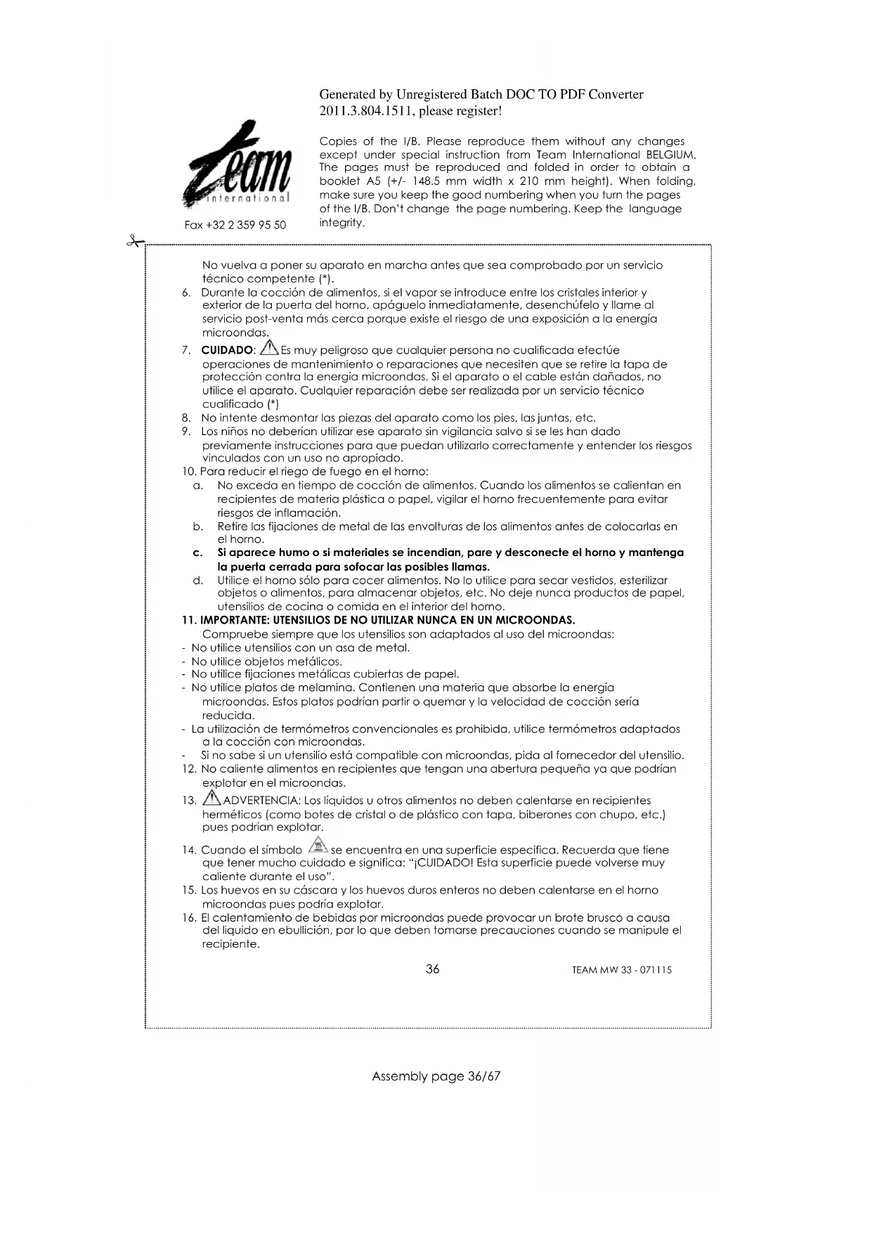 Para poder preservar nuestro medio ambiente y proteger la salud humana, los residuos eléctricos y equipos electrónicos deberían ser destruidos de acuerdo con unas normas especificas con la implicación de ambos proveedores y consumidores. Por esta razón, como indica el símbolo en la placa de datos técnicos, su aparato no debería ser tirado en un contenedor municipal sino que debería ser devuelto a la tienda, o dejado en un punto de recolección para ser reciclado o usado para otras aplicaciones conforme a la directiva.Generated by Unregistered Batch DOC TO PDF Converter 2011.3.804.1511, please register! Copies of the I/B. Please reproduce them without any changes except under special instruction from Team International BELGIUM. The pages must be reproduced and folded in order to obtain a booklet A5 (+/- 148.5 mm width x 210 mm height). When folding, make sure you keep the good numbering when you turn the pages of the I/B. Don‟t change the page numbering. Keep the language integrity.