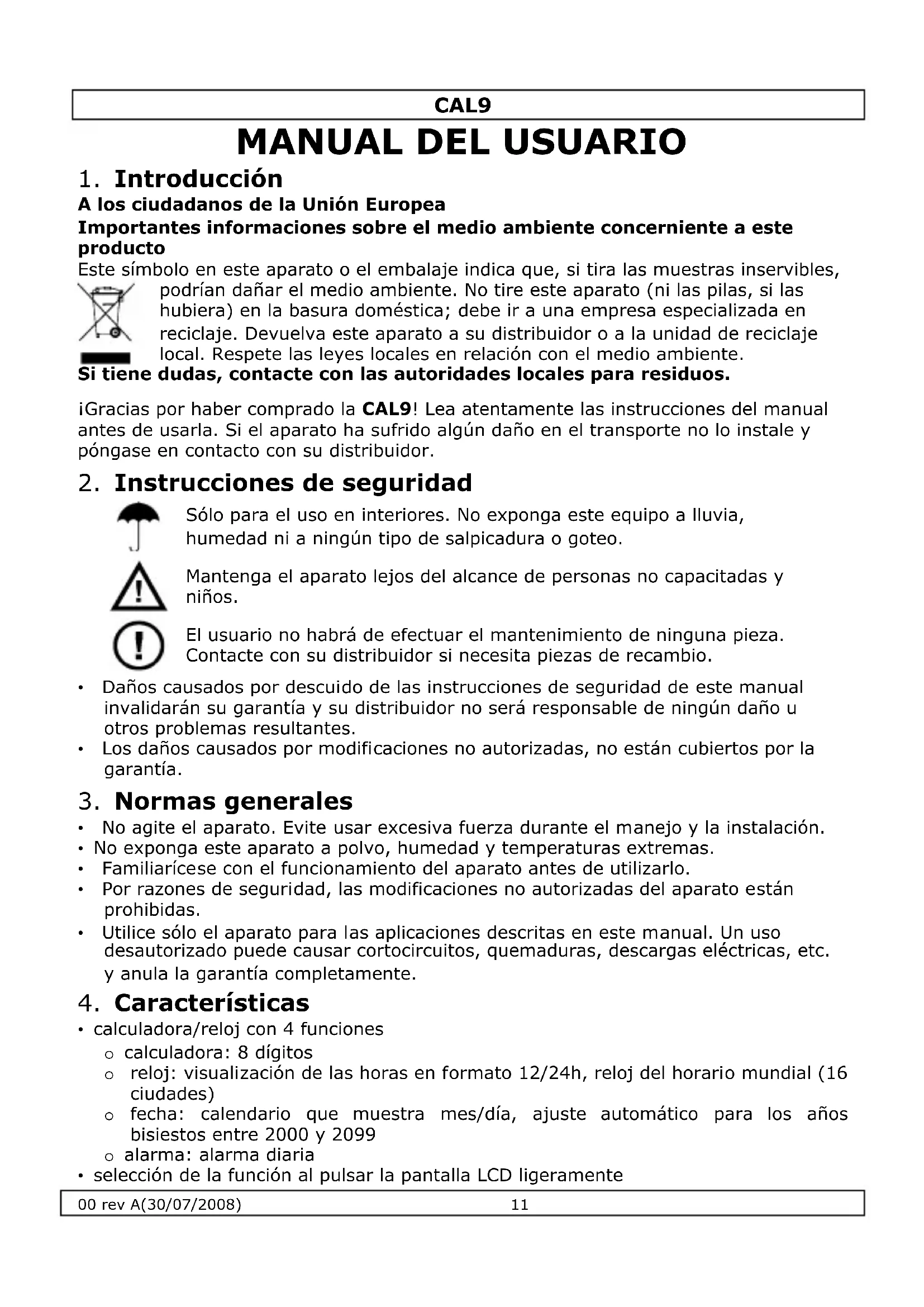 iGracias por haber comprado la CAL9! Lea atentamente las instrucciones del manual antes de usarla. Si el aparato ha sufrido algunos daño en el transporte no lo instale y póngase en contacto con su distribuidor.