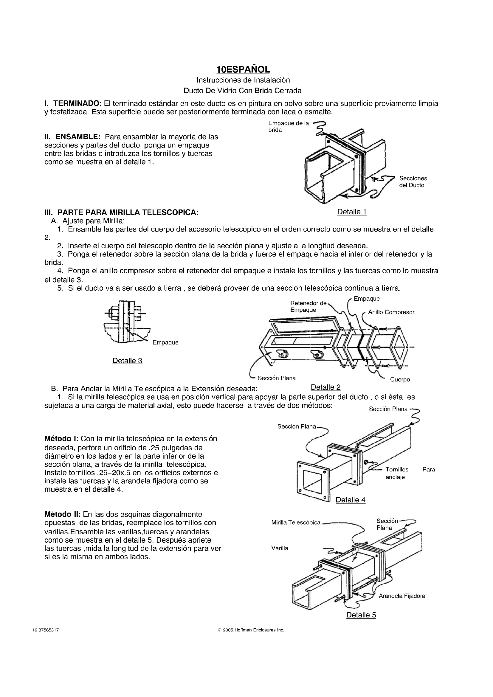 II. ENSAMBLE: Para ensambarla mayoria de las secciones y partes del ducto, ponga un empaque entre las bridas e introduzca los tornillos y tuercas como se muestra en el detalle 1.