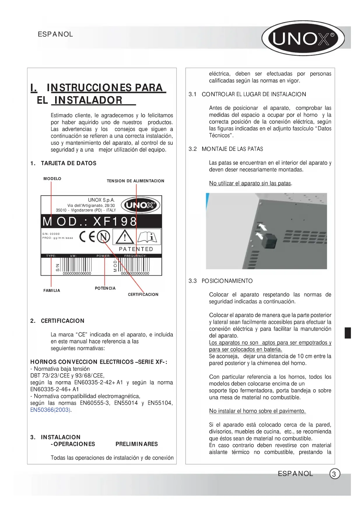 EL INSTALADOR Estimado cliente, le agradecemos y lo felicitamos por haber aquirido uno de nuestros productos. Las advertencias y los consejos que siguen a continuación se refieren a una correcta instalación, uso y mantenimiento del aparato, al control de su seguridad y a una mejor utilización del equipo.1. TARJETA DE DATOS2. CERTIFICACIONLa marca “CE” indicada en el aparato, e incluida en este manual hace referencia a lasseguientes normativas:HORNOS CONVECCION ELECTRICOS –SERIE XF-:- Normativa baja tensiónDBT 73/23/CEE y 93/68/CEE,según la norma EN60335-2-42+A1 y según la norma EN60335-2-46+A1- Normativa compatibilidad electromagnética,según las normas EN60555-3, EN55014 y EN55104, EN50366(2003). 3. INSTALACION -OPERACIONES PRELIMINARESTodas las operaciones de instalación y de conexión eléctrica, deben ser efectuadas por personas calificadas según las normas en vigor.3.1 CONTROLAR EL LUGAR DE INSTALACIONAntes de posicionar el aparato, comprobar las medidas del espacio a ocupar por el horno y la correcta posición de la conexión eléctrica, según las figuras indicadas en el adjunto fascículo “Datos Técnicos”.3.2 MONTAJE DE LAS PATASLas patas se encuentran en el interior del aparato y deven deser necesariamente montadas. No utilizar el aparato sin las patas. 3.3 POSICIONAMIENTOColocar el aparato respetando las normas de seguridad indicadas a continuación.Colocar el aparato de manera que la parte posterior y lateral sean facilmente accesibles para efectuar la conexión eléctrica y para facilitar la manutención del aparato.Los aparatos no son aptos para ser empotrados y para ser colocados en bateria.Se aconseja, dejar una distancia de 10 cm entre la pared posterior y la chimenea del horno.Con particular referencia a los hornos, todos los modelos deben colocarse encima de unsoporte tipo fermentadora, porta bandeja o sobre una mesa de material no combustible.No instalar el horno sobre el pavimento.Si el aparado está colocado cerca de la pared, divisorios, muebles de cucina, etc., se recomienda que éstos sean de material no combustible.En caso contrario deben revestirse con material aislante térmico no combustible, prestando la ESPANOL ESPANOL