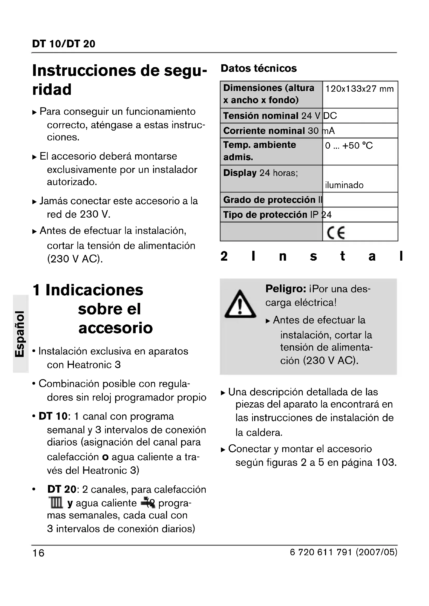 - DT 20: 2 canales, para calefacción y agua caliente (2 progra- mas semanales, cada cual con 3 intervalos de conexión diarios) Datos técnicos 2Instalación B Una descripción detallada de las piezas del aparato la encontrará en las instrucciones de instalación de la caldera. B Conectar y montar el accesorio según figuras 2 a 5 en página 103. Dimensiones (altura x ancho x fondo) 120x133x27 mm Tensión nominal 24 V DC Corriente nominal 30 mA Temp. ambiente admis. 0 ... +50 °C Display 24 horas; iluminado Grado de protección II Tipo de protección IP 24 Peligro: ¡Por una des- carga eléctrica! B Antes de efectuar la instalación, cortar la tensión de alimenta- ción (230 V AC).DT 10/DT 20 Español