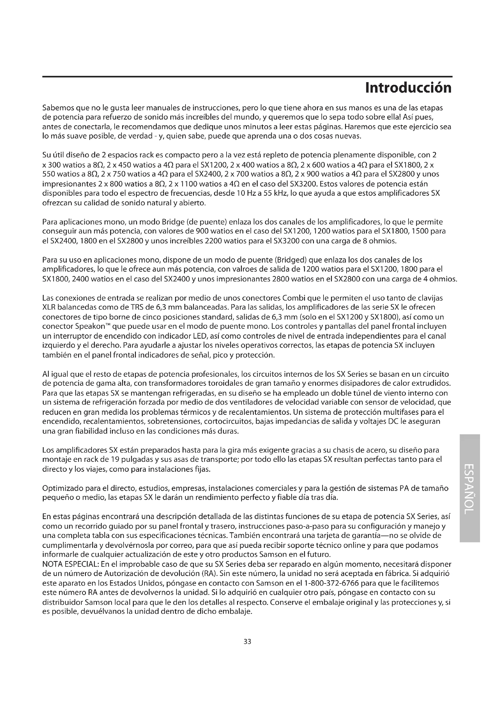 (8 ohm min) (8 ohm min) (8 ohm min) (8 ohm min) MPL2242MMPL2242 Parallel-Modus: (zwei oder vier Boxen) DEUTSCHE 31Ventilatorfilter reinigen Ventilatorfilter reinigen Von Zeit zu Zeit werden Sie die Ventilatorfilter reinigen müssen. Dies ist notwendig, um den maximalen Luftdurchsatz durch den Amp der SX-Serie und somit dessen Kühlung sicherzustellen. Zum Reinigen der Ventilatorfilter gehen Sie einfach wie folgt vor. 1/ Entfernen Sie den Ventilatorfilter, indem Sie einen Finger in den vertieften Bereich unter dem Rahmen des Ventilatorfilters schieben. 2/ Reinigen Sie den Filter mit warmem Wasser und lassen Sie ihn gründlich trocknen, bevor Sie ihn wieder einsetzen. 3/ Setzen Sie den Ventilatorfilter wieder ein, indem Sie den Rahmen auf die Aussparung im Bedienfeld ausrichten und diesen dann in seine ursprüngliche Position einrasten lassen. DEUTSCHE 32Introducción Sabemos que no le gusta leer manuales de instrucciones, pero lo que tiene ahora en sus manos es una de las etapas de potencia para refuerzo de sonido más increíbles del mundo, y queremos que lo sepa todo sobre ella! Así pues, antes de conectarla, le recomendamos que dedique unos minutos a leer estas páginas. Haremos que este ejercicio sea lo más suave posible, de verdad - y, quien sabe, puede que aprenda una o dos cosas nuevas. Su útil diseño de 2 espacios rack es compacto pero a la vez está repleto de potencia plenamente disponible, con 2 x 300 watios a 8Ω, 2 x 450 watios a 4Ω para el SX1200, 2 x 400 watios a 8Ω, 2 x 600 watios a 4Ω para el SX1800, 2 x 550 watios a 8Ω, 2 x 750 watios a 4Ω para el SX2400, 2 x 700 watios a 8Ω, 2 x 900 watios a 4Ω para el SX2800 y unos impresionantes 2 x 800 watios a 8Ω, 2 x 1100 watios a 4Ω en el caso del SX3200. Estos valores de potencia están disponibles para todo el espectro de frecuencias, desde 10 Hz a 55 kHz, lo que ayuda a que estos amplificadores SX ofrezcan su calidad de sonido natural y abierto. Para aplicaciones mono, un modo Bridge (de puente) enlaza los dos canales de los amplificadores, lo que le permite conseguir aun más potencia, con valores de 900 watios en el caso del SX1200, 1200 watios para el SX1800, 1500 para el SX2400, 1800 en el SX2800 y unos increíbles 2200 watios para el SX3200 con una carga de 8 ohmios. Para su uso en aplicaciones mono, dispone de un modo de puente (Bridged) que enlaza los dos canales de los amplificadores, lo que le ofrece aun más potencia, con valroes de salida de 1200 watios para el SX1200, 1800 para el SX1800, 2400 watios en el caso del SX2400 y unos impresionantes 2800 watios en el SX2800 con una carga de 4 ohmios. Las conexiones de entrada se realizan por medio de unos conectores Combi que le permiten el uso tanto de clavijas XLR balancedas como de TRS de 6,3 mm balanceadas. Para las salidas, los amplificadores de las serie SX le ofrecen conectores de tipo borne de cinco posiciones standard, salidas de 6,3 mm (solo en el SX1200 y SX1800), así como un conector Speakon™ que puede usar en el modo de puente mono. Los controles y pantallas del panel frontal incluyen un interruptor de encendido con indicador LED, así como controles de nivel de entrada independientes para el canal izquierdo y el derecho. Para ayudarle a ajustar los niveles operativos correctos, las etapas de potencia SX incluyen también en el panel frontal indicadores de señal, pico y protección. Al igual que el resto de etapas de potencia profesionales, los circuitos internos de los SX Series se basan en un circuito de potencia de gama alta, con transformadores toroidales de gran tamaño y enormes disipadores de calor extrudidos. Para que las etapas SX se mantengan refrigeradas, en su diseño se ha empleado un doble túnel de viento interno con un sistema de refrigeración forzada por medio de dos ventiladores de velocidad variable con sensor de velocidad, que reducen en gran medida los problemas térmicos y de recalentamientos. Un sistema de protección multifases para el encendido, recalentamientos, sobretensiones, cortocircuitos, bajas impedancias de salida y voltajes DC le aseguran una gran fiabilidad incluso en las condiciones más duras. Los amplificadores SX están preparados hasta para la gira más exigente gracias a su chasis de acero, su diseño para montaje en rack de 19 pulgadas y sus asas de transporte; por todo ello las etapas SX resultan perfectas tanto para el directo y los viajes, como para instalaciones fijas. Optimizado para el directo, estudios, empresas, instalaciones comerciales y para la gestión de sistemas PA de tamaño pequeño o medio, las etapas SX le darán un rendimiento perfecto y fiable día tras día. En estas páginas encontrará una descripción detallada de las distintas funciones de su etapa de potencia SX Series, así como un recorrido guiado por su panel frontal y trasero, instrucciones paso-a-paso para su configuración y manejo y una completa tabla con sus especificaciones técnicas. También encontrará una tarjeta de garantía—no se olvide de cumplimentarla y devolvérnosla por correo, para que así pueda recibir soporte técnico online y para que podamos informarle de cualquier actualización de este y otro productos Samson en el futuro. NOTA ESPECIAL: En el improbable caso de que su SX Series deba ser reparado en algún momento, necesitará disponer de un número de Autorización de devolución (RA). Sin este número, la unidad no será aceptada en fábrica. Si adquirió este aparato en los Estados Unidos, póngase en contacto con Samson en el 1-800-372-6766 para que le facilitemos este número RA antes de devolvernos la unidad. Si lo adquirió en cualquier otro país, póngase en contacto con su distribuidor Samson local para que le den los detalles al respecto. Conserve el embalaje original y las protecciones y, si es posible, devuélvanos la unidad dentro de dicho embalaje. ESPAÑOL 33Características de los SX Series Las etapas de potencia Samson SX Series utilizan la tecnología más avanzado en cuanto a