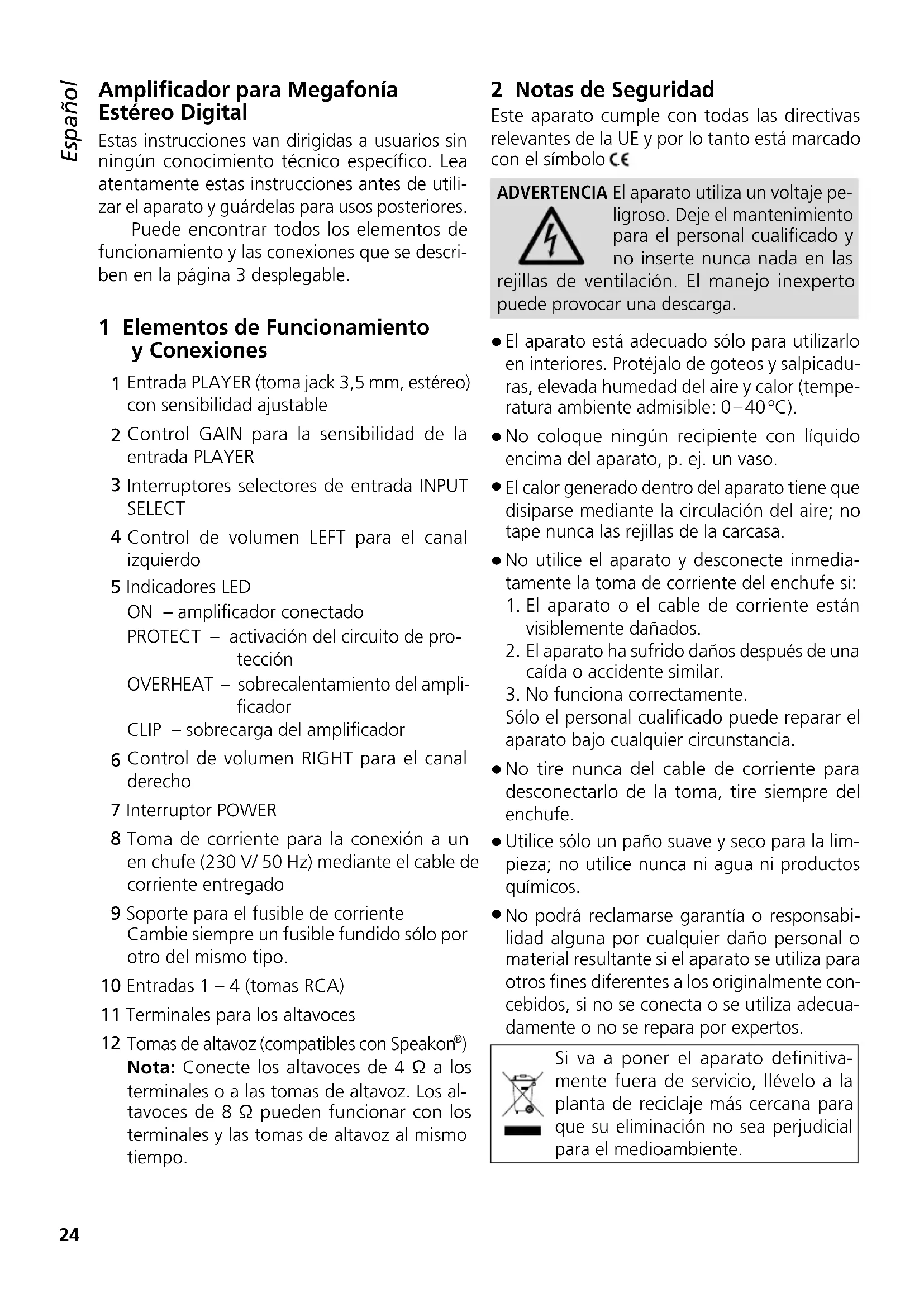 Nota: Conecte los altavoces de 4 Ω a los terminales o a las tomas de altavoz. Los al- tavoces de 8 Ω pueden funcionar con los terminales y las tomas de altavoz al mismo tiempo. 2 Notas de Seguridad Este aparato cumple con todas las directivas relevantes de la UE y por lo tanto está marcado con el símbolo . ADVERTENCIA El aparato utiliza un voltaje pe- ligroso. Deje el mantenimiento para el personal cualificado y no inserte nunca nada en las rejillas de ventilación. El manejo inexperto puede provocar una descarga.