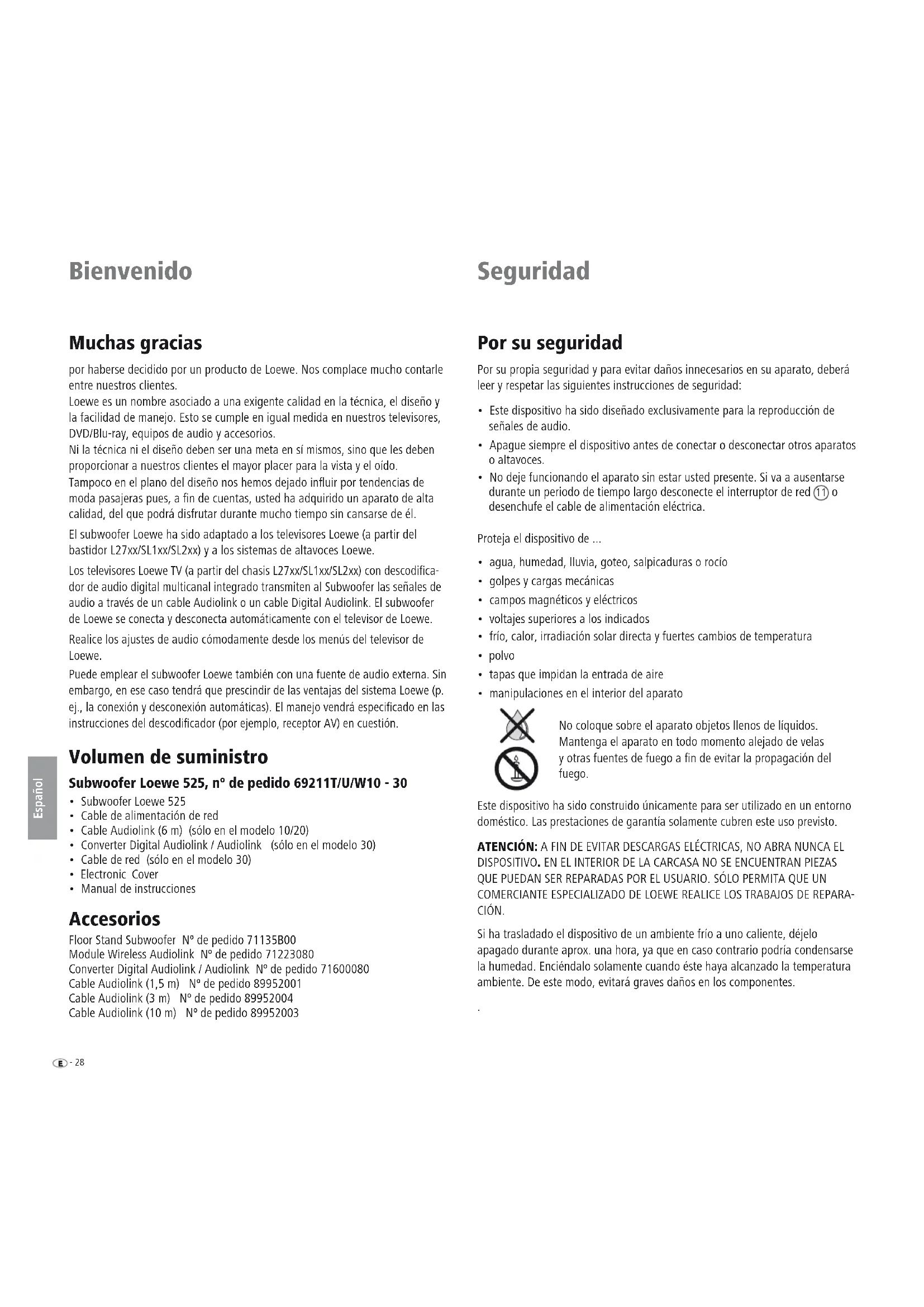 WDPHQWHODSSDUHFFKLDWXUDJLXQWDDÀQHYLWDDJOLLGRQHLFHQWUL di raccolta, oppure riconsegnarla al rivenditore al momento dell'acquisto di una nuova apparecchiatura equivalente. Per maggiori dettagli circa il ritiro (anche per i paesi non apparte- nenti alla UE) si prega di rivolgersi alle amministrazioni locali.- 28Español Bienvenido Muchas gracias por haberse decidido por un producto de Loewe. Nos complace mucho contarle entre nuestros clientes. Loewe es un nombre asociado a una exigente calidad en la técnica, el diseño y la facilidad de manejo. Esto se cumple en igual medida en nuestros televisores, DVD/Blu-ray, equipos de audio y accesorios. Ni la técnica ni el diseño deben ser una meta en sí mismos, sino que les deben proporcionar a nuestros clientes el mayor placer para la vista y el oído. 7DPSRFRHQHOSODQRGHOGLVHxRQRVKHPRVGHMDGRLQÁXLUSRUWHQGHQFLDVGH PRGDSDVDMHUDVSXHVDÀQGHFXHQWDVXVWHGKDDGTXLULGRXQDSDUDWRGHDOWD calidad, del que podrá disfrutar durante mucho tiempo sin cansarse de él. El subwoofer Loewe ha sido adaptado a los televisores Loewe (a partir del bastidor L27xx/SL1xx/SL2xx) y a los sistemas de altavoces Loewe.