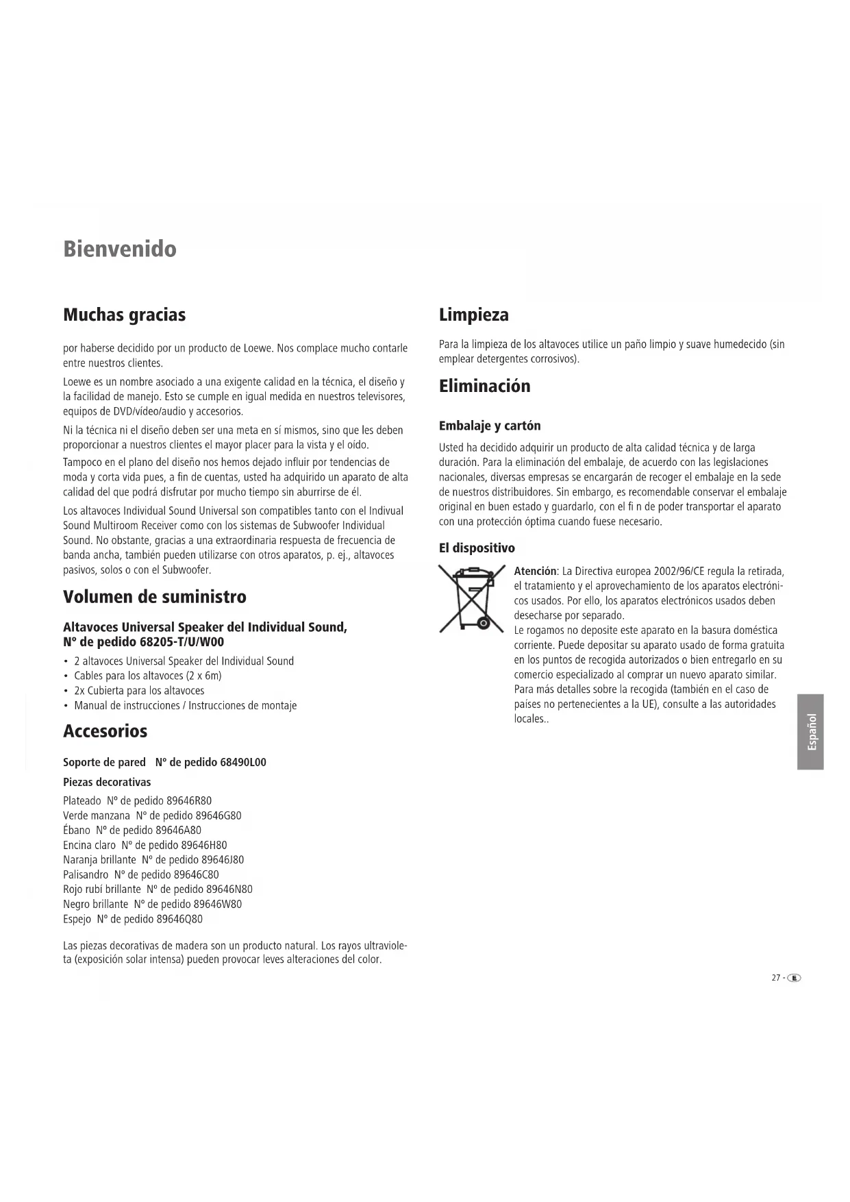 Nº de pedido 68490L00 Piezas decorativas Plateado Nº de pedido 89646R80 Verde manzana Nº de pedido 89646G80 Ébano Nº de pedido 89646A80 Encina claro Nº de pedido 89646H80 Naranja brillante Nº de pedido 89646J80 Palisandro Nº de pedido 89646C80 Rojo rubí brillante Nº de pedido 89646N80 Negro brillante Nº de pedido 89646W80 Espejo Nº de pedido 89646Q80 Las piezas decorativas de madera son un producto natural. Los rayos ultraviole- ta (exposición solar intensa) pueden provocar leves alteraciones del color. Limpieza Para la limpieza de los altavoces utilice un paño limpio y suave humedecido (sin emplear detergentes corrosivos). Eliminación Embalaje y cartón Usted ha decidido adquirir un producto de alta calidad técnica y de larga duración. Para la eliminación del embalaje, de acuerdo con las legislaciones nacionales, diversas empresas se encargarán de recoger el embalaje en la sede de nuestros distribuidores. Sin embargo, es recomendable conservar el embalaje original en buen estado y guardarlo, con el fi n de poder transportar el aparato con una protección óptima cuando fuese necesario. El dispositivo Atención: La Directiva europea 2002/96/CE regula la retirada, el tratamiento y el aprovechamiento de los aparatos electróni- cos usados. Por ello, los aparatos electrónicos usados deben desecharse por separado. Le rogamos no deposite este aparato en la basura doméstica corriente. Puede depositar su aparato usado de forma gratuita en los puntos de recogida autorizados o bien entregarlo en su comercio especializado al comprar un nuevo aparato similar. Para más detalles sobre la recogida (también en el caso de países no pertenecientes a la UE), consulte a las autoridades locales..- 28 Español Por su seguridad Por su propia seguridad y para evitar daños innecesarios en su aparato, deberá leer y respetar las siguientes instrucciones de seguridad:
