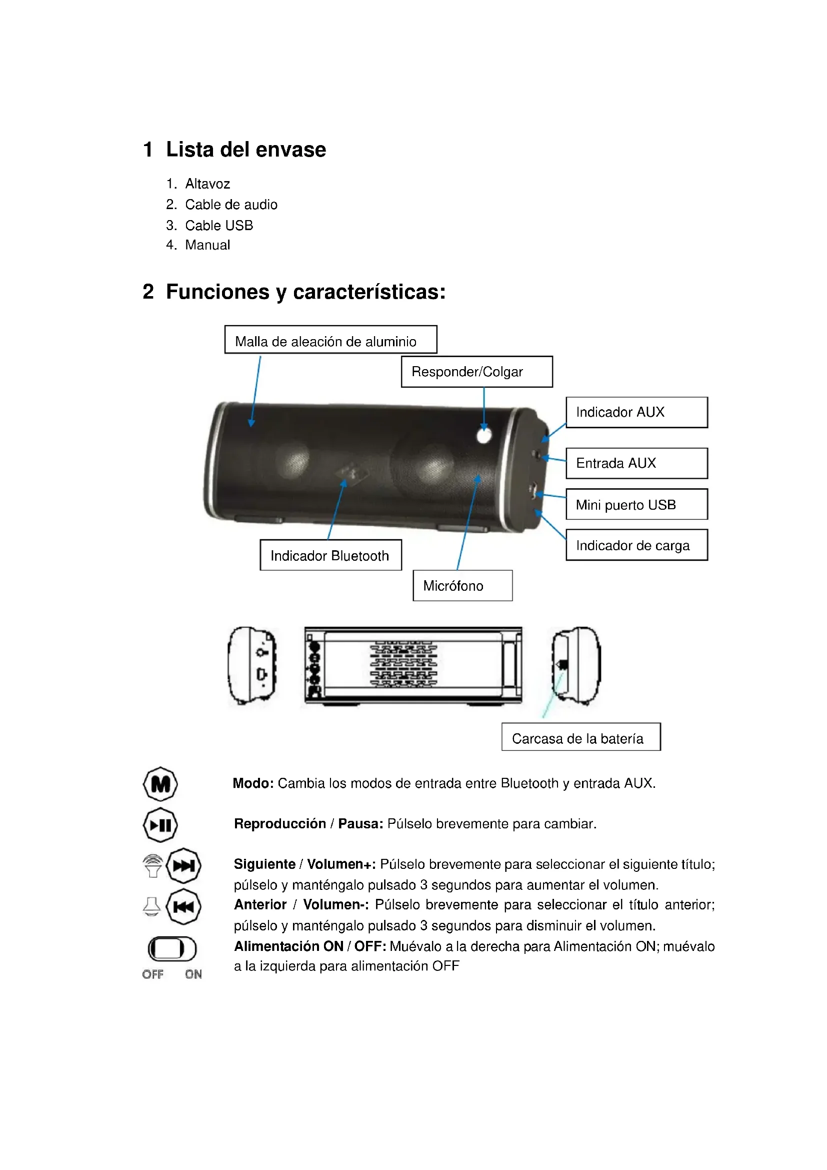 Carcasa de la batería Micrófono Indicador Bluetooth Indicador de carga Mini puerto USB Entrada AUX Indicador AUX Responder/Colgar Malla de aleación de aluminio Modo: Cambia los modos de entrada entre Bluetooth y entrada AUX. Reproducción / Pausa: Púlselo brevemente para cambiar. Siguiente / Volumen+: Púlselo brevemente para seleccionar el siguiente título; púlselo y manténgalo pulsado 3 segundos para aumentar el volumen. Anterior / Volumen-: Púlselo brevemente para seleccionar el título anterior; púlselo y manténgalo pulsado 3 segundos para disminuir el volumen. Alimentación ON / OFF: Muévalo a la derecha para Alimentación ON; muévalo a la izquierda para alimentación OFF3 Emparejamiento del Bluetooth Alimentación ON, ALBRECHT MAX-treme entra de forma automática en modo Bluetooth; el indicador LED se ilumina y parpadea rápidamente. Ahora puede empezar la búsqueda Bluetooth. El dispositivo Bluetooth mostrará el “Albrecht MAX-treme” en la lista de dispositivos. Ahora puede conectarlo; si se el dispositivo Bluetooth solicita una contraseña, introduzca “0000”. El dispositivo Bluetooth se habrá emparejado con éxito al altavoz cuando la luz del indicador Bluetooth parpadee una vez cada 5 segundos. 4 Reproducir y hablar mediante el Bluetooth