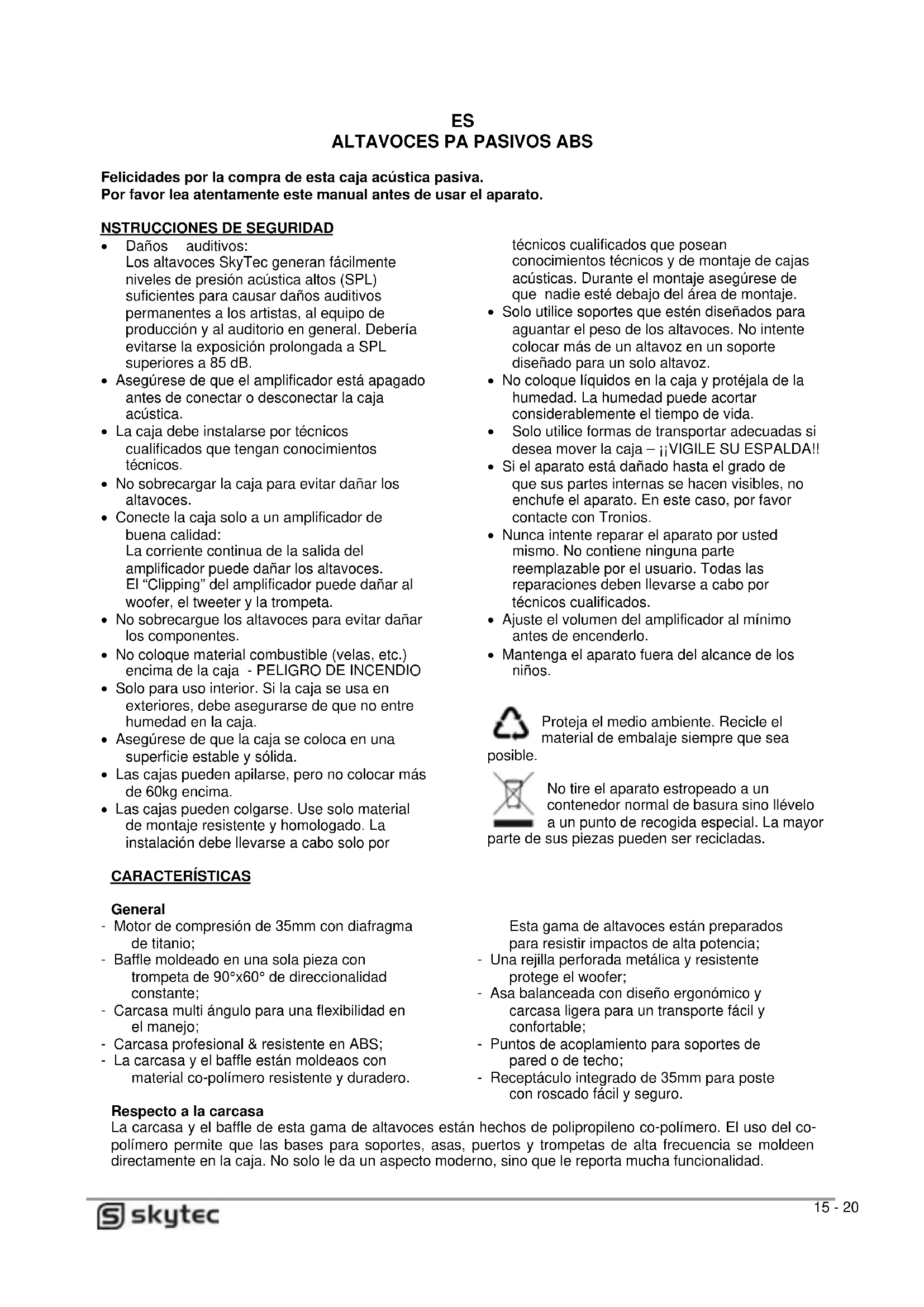 Los altavoces SkyTec generan fácilmente niveles de presión acústica altos (SPL) suficientes para causar daños auditivos permanentes a los artistas, al equipo de producción y al auditorio en general. Debería evitarse la exposición prolongada a SPL superiores a 85 dB. - Asegúrese de que el amplificador está apagado antes de conectar o desconectar la caja acústica.