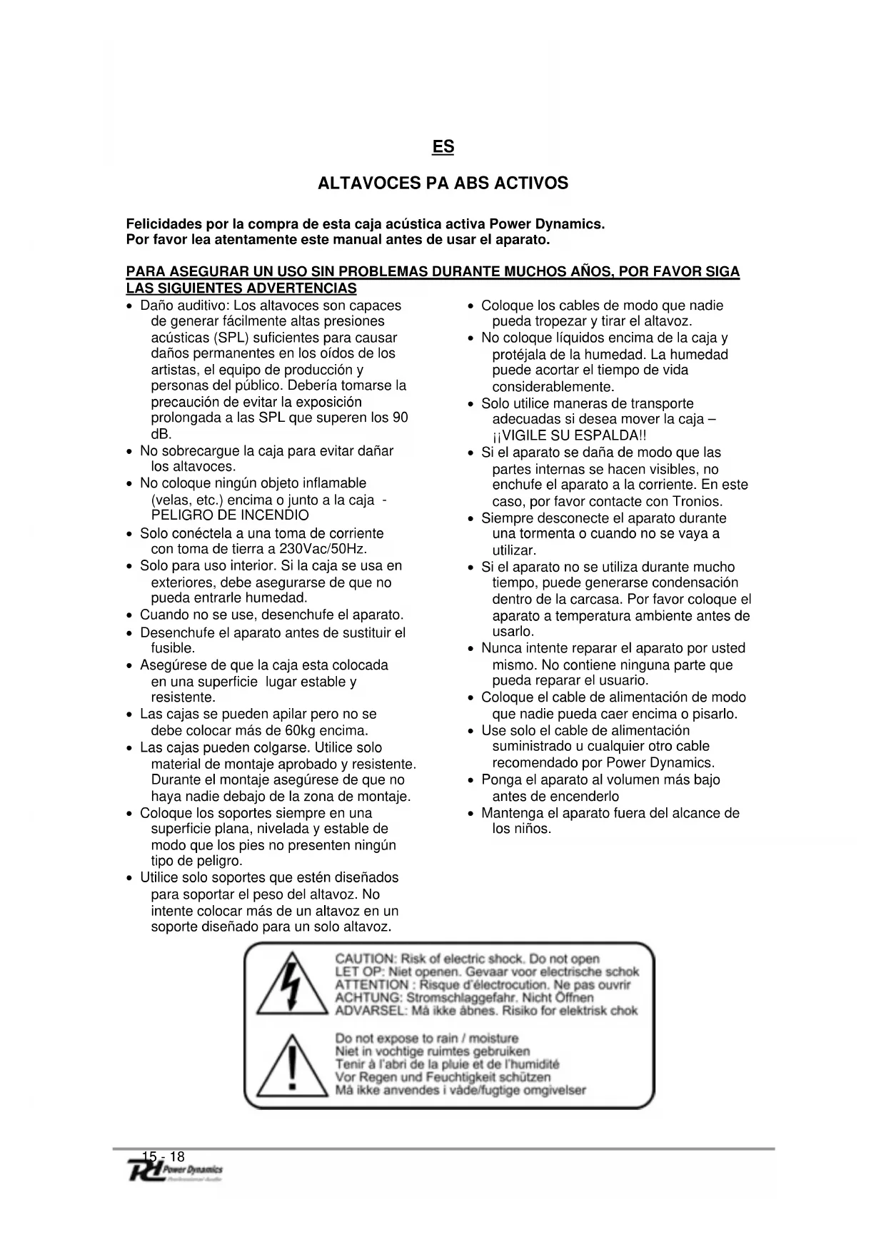 Felicidades por la compra de esta caja acústica activa Power Dynamics. Por favor lea atentamente este manual antes de usar el aparato.