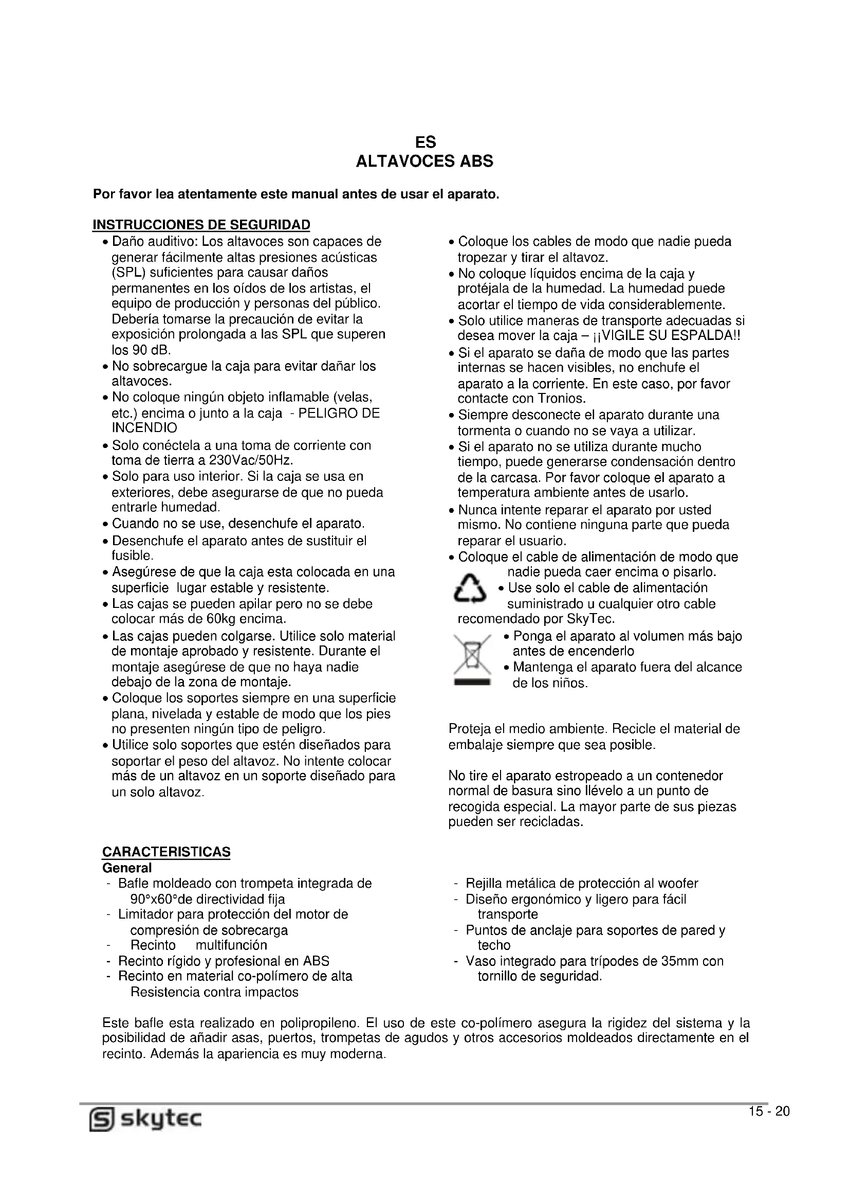 Proteja el medio ambiente. Recicle el material de embalaje siempre que sea posible. No tire el aparato estropeado a un contenedor normal de basura sino llévelo a un punto de recogida especial. La mayor parte de sus piezas pueden ser recicladas. CARACTERISTICAS General - Bafle moldeado con trompeta integrada de 90°x60°de directividad fija - Limitador para protección del motor de compresión de sobrecarga - Recinto multifunción - Recinto rígido y profesional en ABS - Recinto en material co-polímero de alta Resistencia contra impactos - Rejilla metálica de protección al woofer - Diseño ergonómico y ligero para fácil transporte - Puntos de anclaje para soportes de pared y techo - Vaso integrado para trípodes de 35mm con tornillo de seguridad. Este bafle esta realizado en polipropileno. El uso de este co-polímero asegura la rigidez del sistema y la posibilidad de añadir asas, puertos, trompetas de agudos y otros accesorios moldeados directamente en el recinto. Además la apariencia es muy moderna.16 - 20 PANEL ENTRADAS Version 20cm/8” Version 25cm/10” :