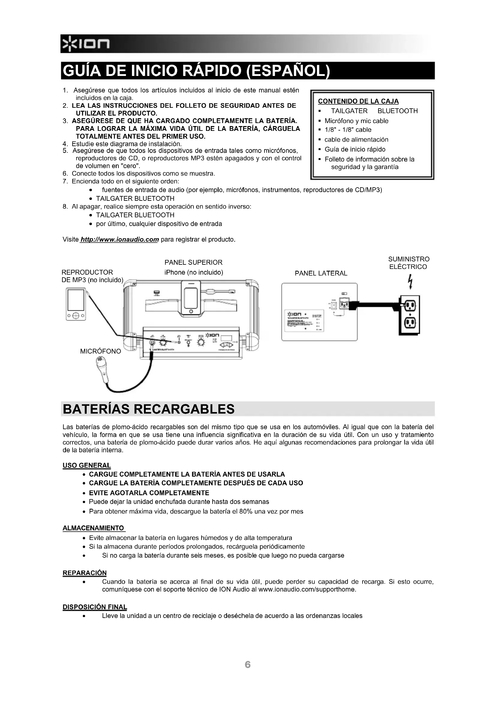 - Lleve la unidad a un centro de reciclaje o deséchela de acuerdo a las ordenanzas locales Visite http://www.ionaudio.com para registrar el producto. CONTENIDO DE LA CAJA TAILGATER BLUETOOTH Micrófono y mic cable 1/8" - 1/8" cable cable de alimentación Guía de inicio rápido Folleto de información sobre la seguridad y la garantía PANEL SUPERIOR PANEL LATERAL MICRÓFONO iPhone (no incluido) SUMINISTRO ELÉCTRICO REPRODUCTOR DE MP3 (no incluido)7