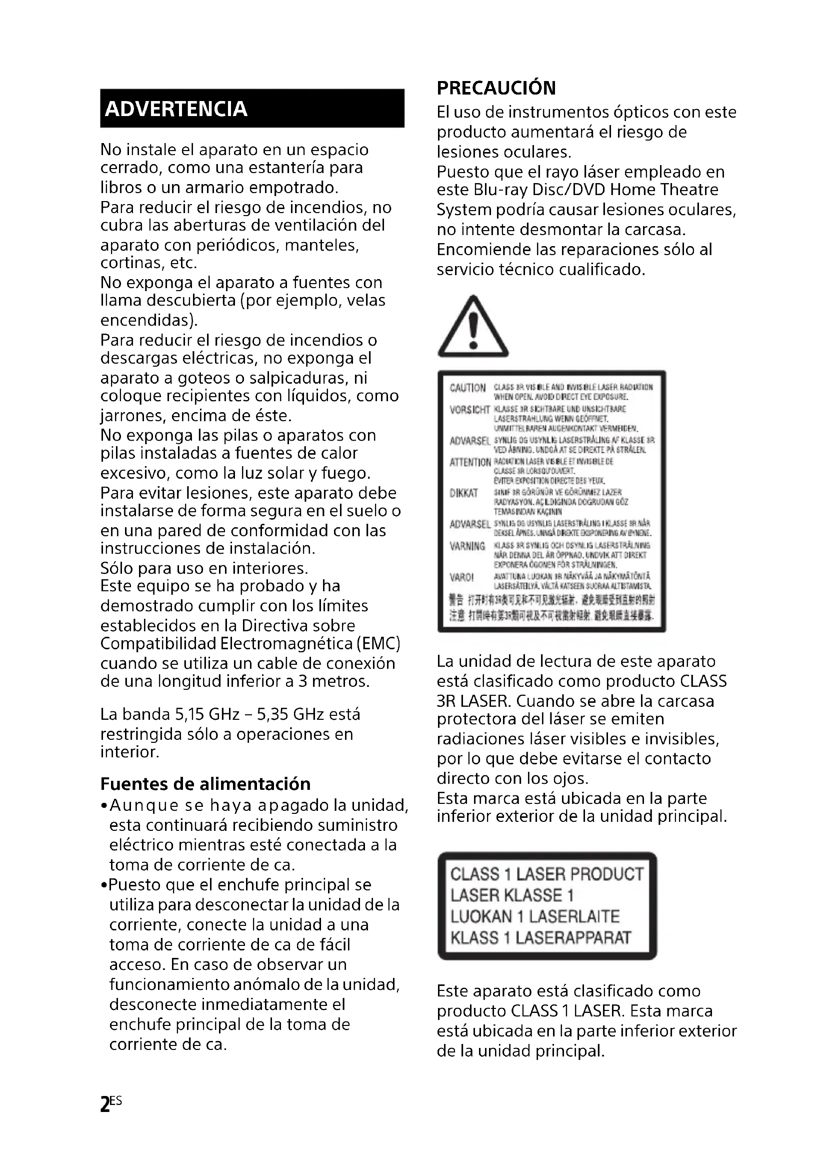- Puesto que el enchufe principal se utiliza para desconectar la unidad de la corriente, conecte la unidad a una toma de corriente de ca de fácil acceso. En caso de observar un funcionamiento anómalo de la unidad, desconecte inmediatamente el enchufe principal de la toma de corriente de ca. PRECAUCIÓN El uso de instrumentos ópticos con este producto aumentará el riesgo de lesiones oculares. Puesto que el rayo láser empleado en este Blu-ray Disc/DVD Home Theatre System podría causar lesiones oculares, no intente desmontar la carcasa. Encomiende las reparaciones sólo al servicio técnico cualificado. La unidad de lectura de este aparato está clasificado como producto CLASS 3R LASER. Cuando se abre la carcasa protectora del láser se emiten radiaciones láser visibles e invisibles, por lo que debe evitarse el contacto directo con los ojos. Esta marca está ubicada en la parte inferior exterior de la unidad principal. Este aparato está clasificado como producto CLASS 1 LASER. Esta marca está ubicada en la parte inferior exterior de la unidad principal. ADVERTENCIAD:\NORM'S JOB\SONY HA\SO160050\BDV-N9200_7200_5200_Ref (PMRF 05)\4485833161_GBFRESDENLITPL (CEK)\ES\020REG.fm masterpage: Right