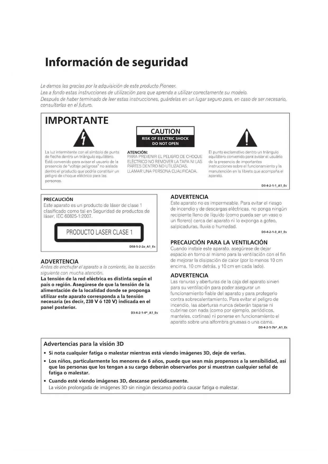 IMPORTANTE D3-4-2-1-1_A1_EsPRECAUCIÓNEste aparato es un producto de láser de clase 1 clasificado como tal en Seguridad de productos de láser, IEC 60825-1:2007.