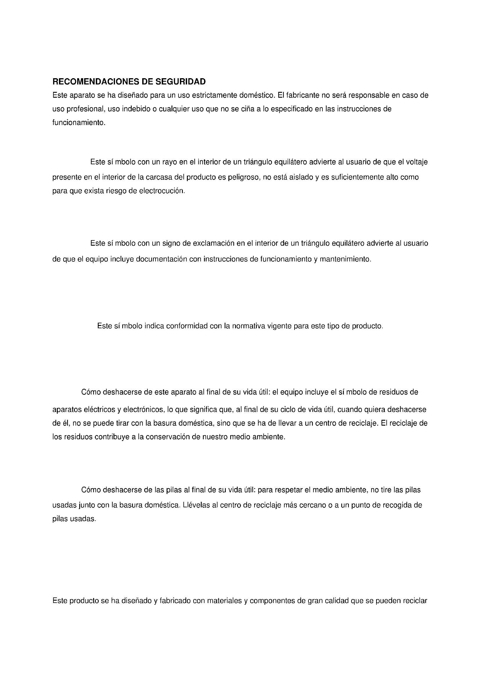 - Este aparato se ha diseñado para un uso estrictamente doméstico. El fabricante no será responsable en caso de uso profesional, uso indebido o cualquier uso que no se ciña a lo especificado en las instrucciones de funcionamiento.
