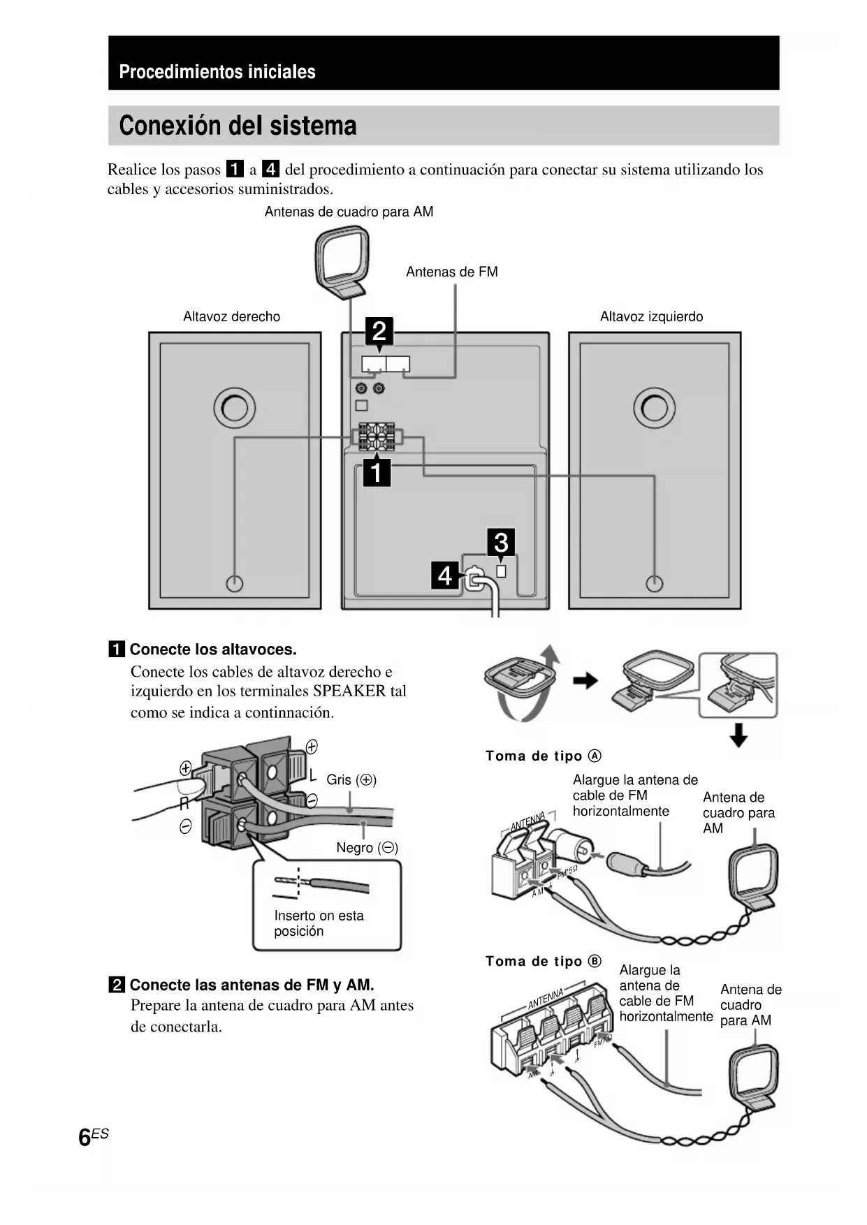 2 Conecte las antenas de FM y AM. Prepare la antena de cuadro para AM antes de conectarla. Antena decuadro para Alargue la antena decable de FMhorizontalmenteAntena decuadropara AMAlargue laantena decable de FMhorizontalmenteInserto on estaposiciónNegro (#)Gris (3)Procedimientos iniciales