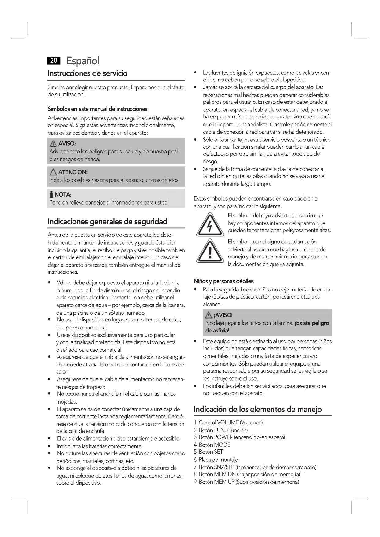 Instrucciones de servicio Gracias por elegir nuestro producto. Esperamos que disfrute de su utilización. Símbolos en este manual de instrucciones Advertencias importantes para su seguridad están señaladas en especial. Siga estas advertencias incondicionalmente, para evitar accidentes y daños en el aparato: AVISO: Advierte ante los peligros para su salud y demuestra posi- bles riesgos de herida. ATENCIÓN: Indica los posibles riesgos para el aparato u otros objetos. NOTA: Pone en relieve consejos e informaciones para usted. Indicaciones generales de seguridad Antes de la puesta en servicio de este aparato lea dete- nidamente el manual de instrucciones y guarde éste bien incluido la garantía, el recibo de pago y si es posible también el cartón de embalaje con el embalaje interior. En caso de dejar el aparato a terceros, también entregue el manual de instrucciones.