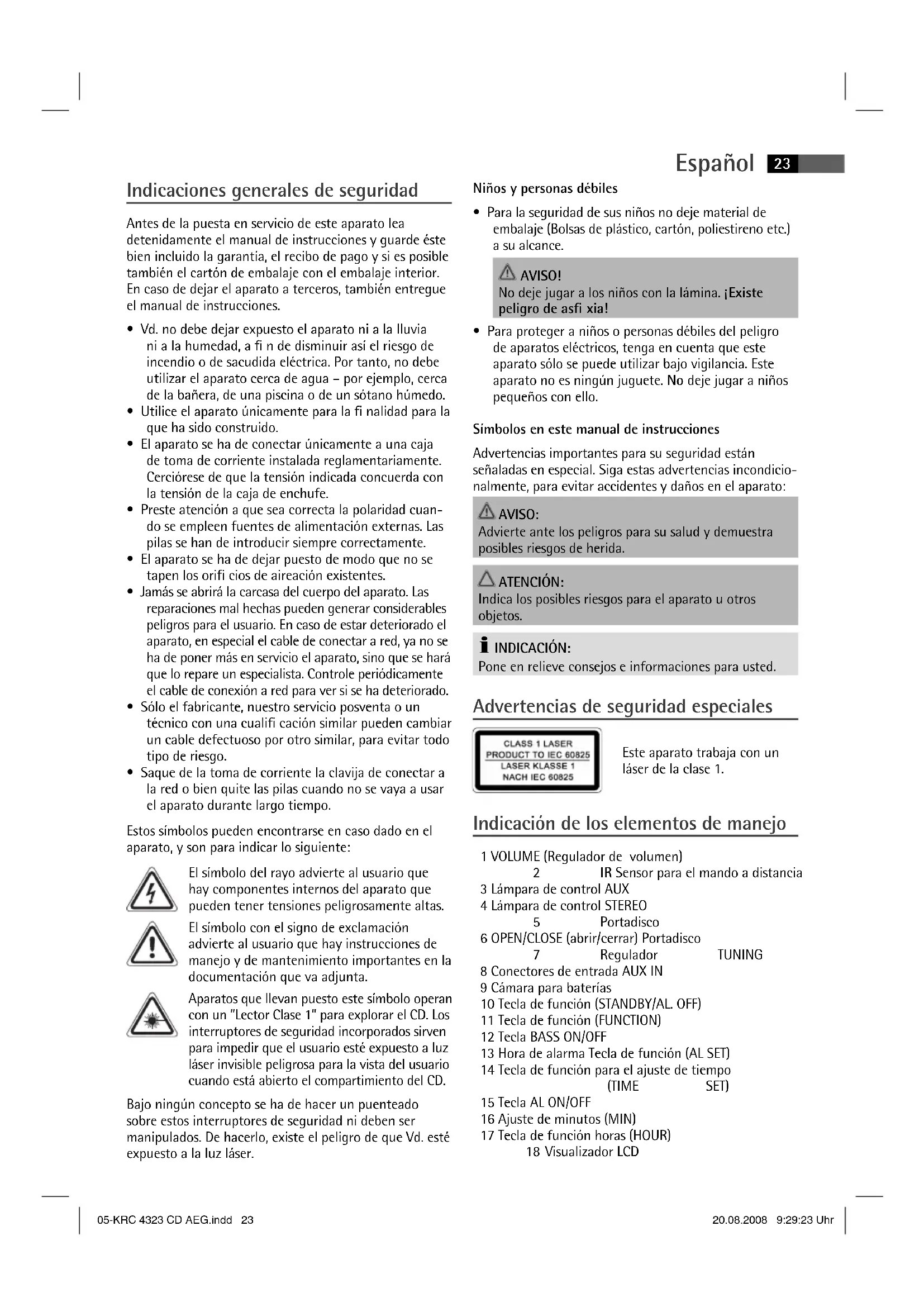 - Para proteger a niños o personas débiles del peligro de aparatos eléctricos, tenga en cuenta que este aparato sólo se puede utilizar bajo vigilancia. Este aparato no es ningún juguete. No deje jugar a niños pequeños con ello. Símbolos en este manual de instrucciones Advertencias importantes para su seguridad están señaladas en especial. Siga estas advertencias incondicio- nalmente, para evitar accidentes y daños en el aparato: AVISO: Advierte ante los peligros para su salud y demuestra posibles riesgos de herida. ATENCIÓN: Indica los posibles riesgos para el aparato u otros objetos. INDICACIÓN: Pone en relieve consejos e informaciones para usted. Advertencias de seguridad especiales Este aparato trabaja con un láser de la clase 1. Indicación de los elementos de manejo 1 VOLUME (Regulador de volumen) 2 IR Sensor para el mando a distancia 3 Lámpara de control AUX 4 Lámpara de control STEREO 5 Portadisco 6 OPEN/CLOSE (abrir/cerrar) Portadisco 7 Regulador TUNING 8 Conectores de entrada AUX IN 9 Cámara para baterías 10 Tecla de función (STANDBY/AL. OFF) 11 Tecla de función (FUNCTION) 12 Tecla BASS ON/OFF 13 Hora de alarma Tecla de función (AL SET) 14 Tecla de función para el ajuste de tiempo (TIME SET) 15 Tecla AL ON/OFF 16 Ajuste de minutos (MIN) 17 Tecla de función horas (HOUR) 18 Visualizador LCD 05-KRC 4323 CD AEG.indd 2305-KRC 4323 CD AEG.indd 23 20.08.2008 9:29:23 Uhr20.08.2008 9:29:23 UhrEspañol
