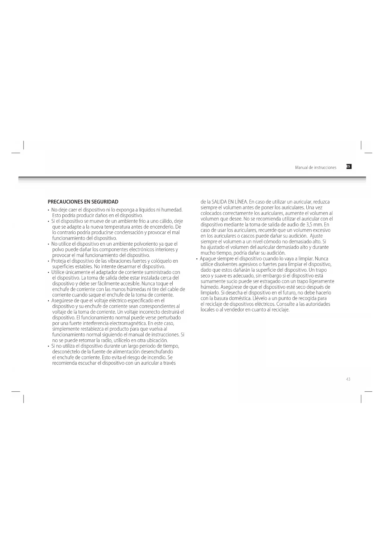- Apague siempre el dispositivo cuando lo vaya a limpiar. Nunca utilice disolventes agresivos o fuertes para limpiar el dispositivo, dado que estos dañarán la superficie del dispositivo. Un trapo seco y suave es adecuado, sin embargo si el dispositivo está sumamente sucio puede ser estragado con un trapo ligeramente húmedo. Asegúrese de que el dispositivo esté seco después de limpiarlo. Si desecha el dispositivo en el futuro, no debe hacerlo con la basura doméstica. Llévelo a un punto de recogida para el reciclaje de dispositivos eléctricos. Consulte a las autoridades locales o al vendedor en cuanto al reciclaje. Manual de instrucciones ES44 Manual de instrucciones