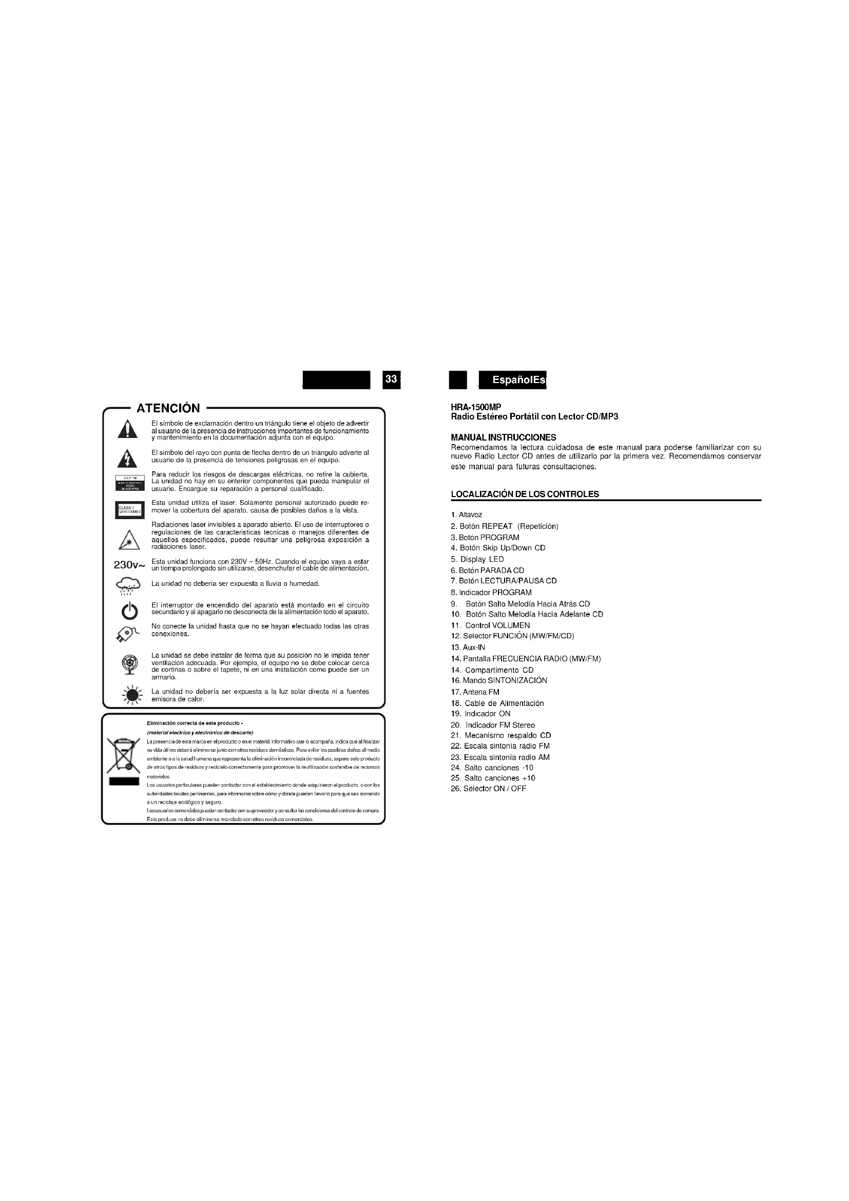 HRA-1500MP Radio Estéreo Portátil con Lector CD/MP3 MANUAL INSTRUCCIONES Recomendamos la lectura cuidadosa de este manual para poderse familiarizar con su nuevo Radio Lector CD antes de utilizarlo por la primera vez. Recomendamos conservar este manual para futuras consultaciones.