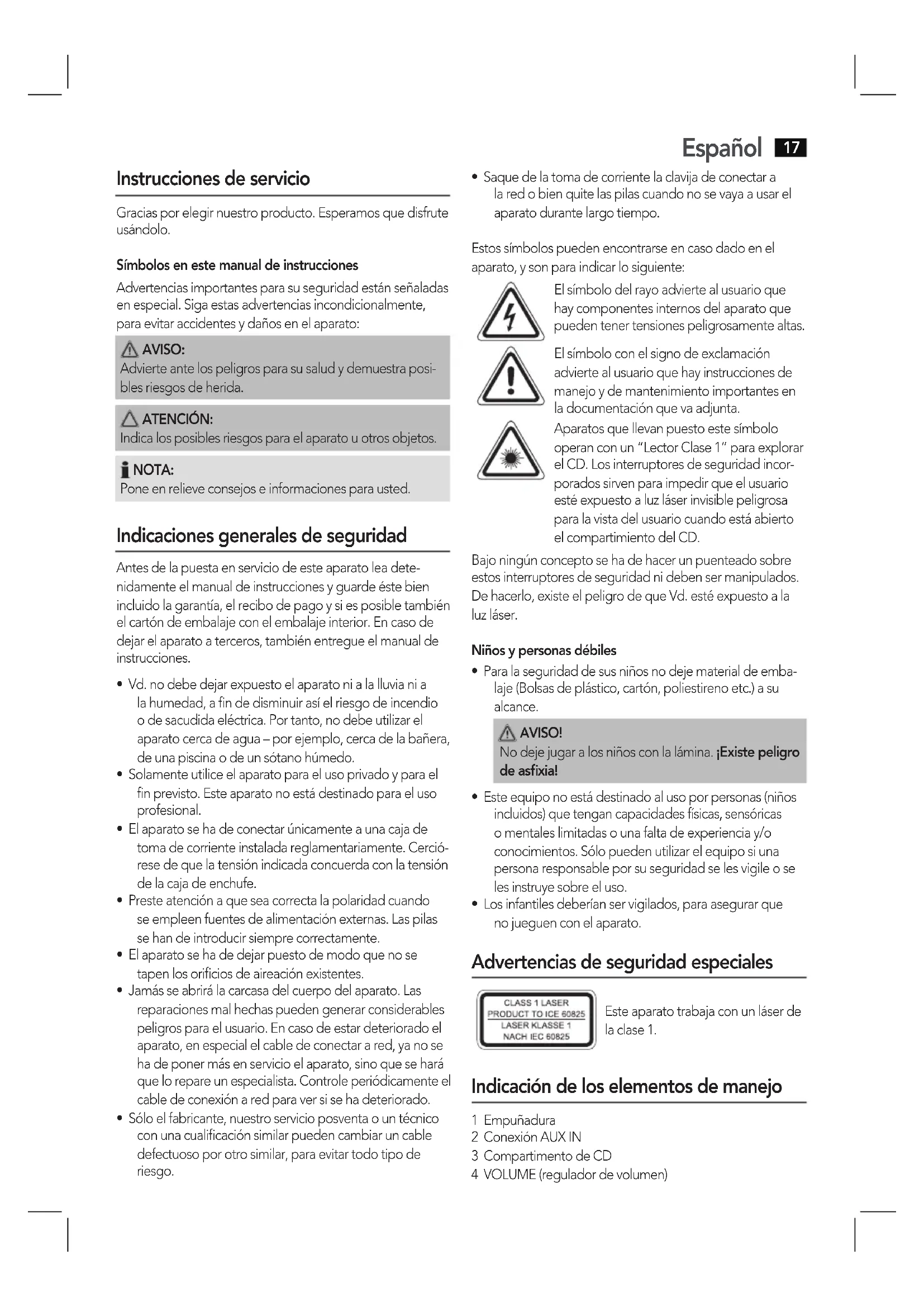 - Los infantiles deberían ser vigilados, para asegurar que no jueguen con el aparato. Advertencias de seguridad especiales Este aparato trabaja con un láser de la clase 1. Indicación de los elementos de manejo 1 Empuñadura 2 Conexión AUX IN 3 Compartimento de CD 4 VOLUME (regulador de volumen)Español