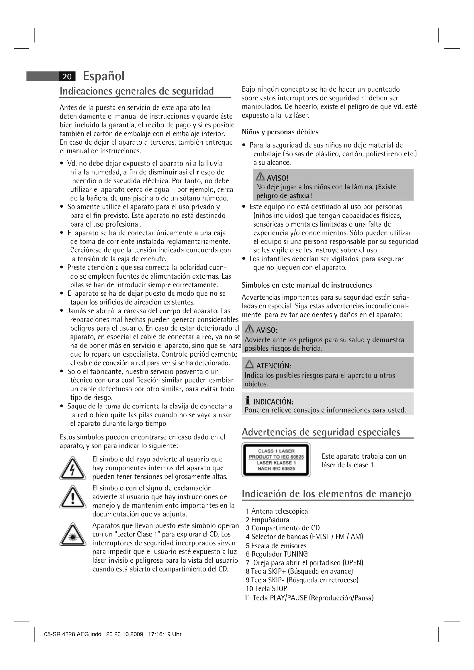 - Los infantiles deberían ser vigilados, para asegurar que no jueguen con el aparato. Símbolos en este manual de instrucciones Advertencias importantes para su seguridad están seña- ladas en especial. Siga estas advertencias incondicional- mente, para evitar accidentes y daños en el aparato: AVISO: Advierte ante los peligros para su salud y demuestra posibles riesgos de herida. ATENCIÓN: Indica los posibles riesgos para el aparato u otros objetos. INDICACIÓN: Pone en relieve consejos e informaciones para usted. Advertencias de seguridad especiales Este aparato trabaja con un láser de la clase 1. Indicación de los elementos de manejo 1 Antena telescópica 2 Empuñadura 3 Compartimento de CD 4 Selector de bandas (FM.ST / FM / AM) 5 Escala de emisores 6 Regulador TUNING 7 Oreja para abrir el portadisco (OPEN) 8 Tecla SKIP+ (Búsqueda en avance) 9 Tecla SKIP- (Búsqueda en retroceso) 10 Tecla STOP 11 Tecla PLAY/PAUSE (Reproducción/Pausa) 05-SR 4328 AEG.indd 20 20.10.2009 17:16:19 UhrEspañol