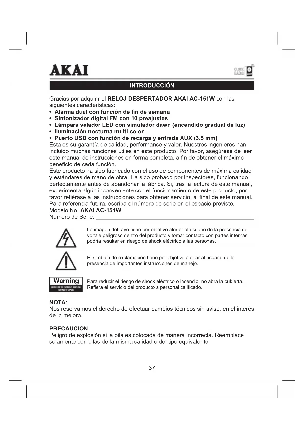 - Puerto USB con función de recarga y entrada AUX (3.5 mm) Esta es su garantía de calidad, performance y valor. Nuestros ingenieros han incluido muchas funciones útiles en este producto. Por favor, asegúrese de leer este manual de instrucciones en forma completa, a n de obtener el máximo benecio de cada función. Este producto ha sido fabricado con el uso de componentes de máxima calidad y estándares de mano de obra. Ha sido probado por inspectores, funcionando perfectamente antes de abandonar la fábrica. Si, tras la lectura de este manual, experimenta algún inconveniente con el funcionamiento de este producto, por favor reérase a las instrucciones para obtener servicio, al nal de este manual. Para referencia futura, escriba el número de serie en el espacio provisto. Modelo No: AKAI AC-151W Número de Serie: NOTA: Nos reservamos el derecho de efectuar cambios técnicos sin aviso, en el interés de la mejora. PRECAUCION Peligro de explosión si la pila es colocada de manera incorrecta. Reemplace solamente con pilas de la misma calidad o del tipo equivalente. La imagen del rayo tiene por objetivo alertar al usuario de la presencia de voltaje peligroso dentro del producto y tomar contacto con partes internas podría resultar en riesgo de shock eléctrico a las personas. El símbolo de exclamación tiene por objetivo alertar al usuario de la presencia de importantes instrucciones de manejo. Para reducir el riesgo de shock eléctrico o incendio, no abra la cubierta. Reera el servicio del producto a personal calicado. WarningIMPORTANTE! Se recomienda no dejar un teléfono móvil cerca de la unidad con el n de evitar la interferencia electromagnética en altavoces. Este equipo es un aparato eléctrico de Clase II o de doble aislamiento. Ha sido diseñado de manera que no requiera conexión eléctrica de cable a tierra.