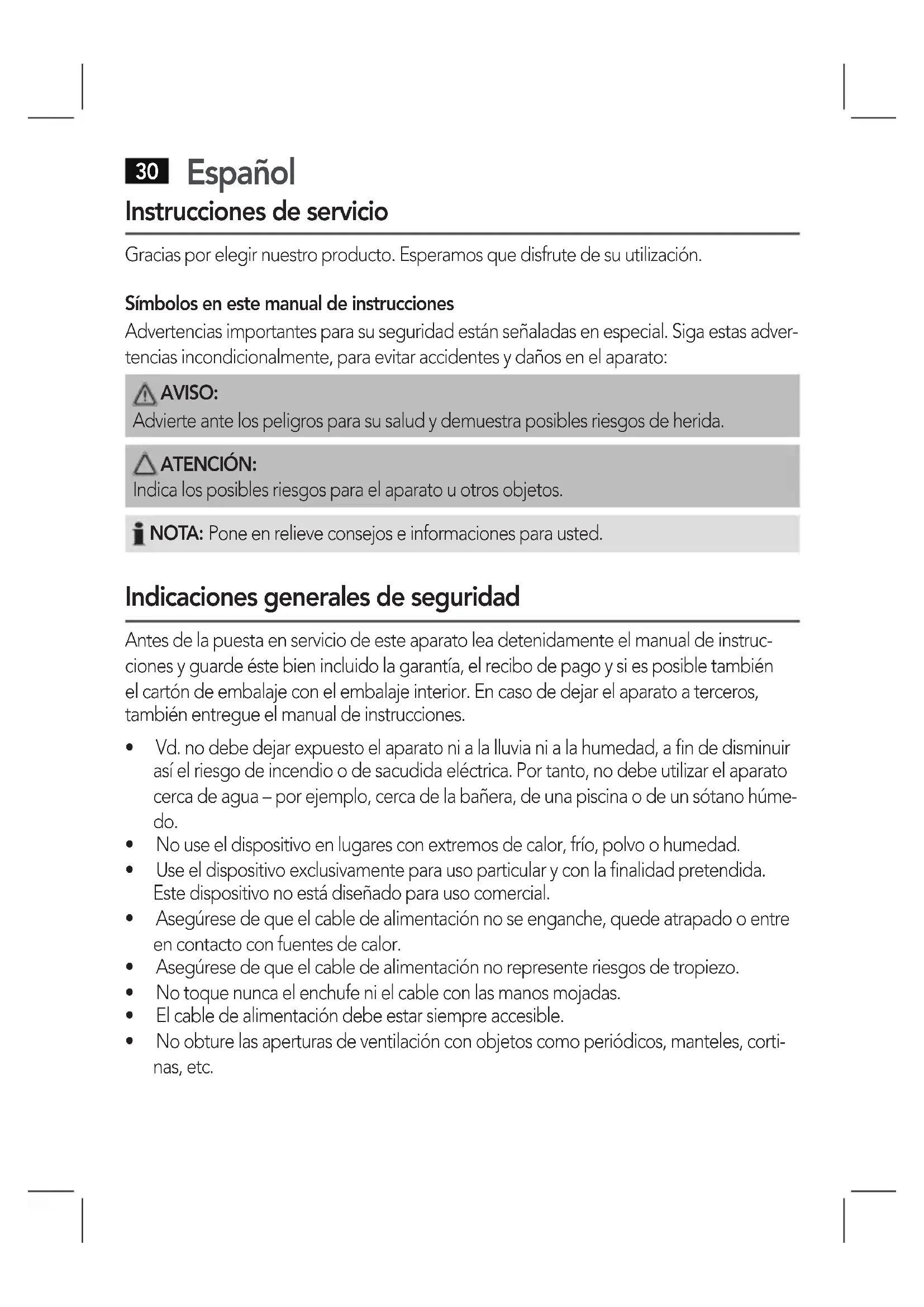 Instrucciones de servicio Gracias por elegir nuestro producto. Esperamos que disfrute de su utilización. Símbolos en este manual de instrucciones Advertencias importantes para su seguridad están señaladas en especial. Siga estas adver- tencias incondicionalmente, para evitar accidentes y daños en el aparato: AVISO: Advierte ante los peligros para su salud y demuestra posibles riesgos de herida. ATENCIÓN: Indica los posibles riesgos para el aparato u otros objetos. NOTA: Pone en relieve consejos e informaciones para usted. Indicaciones generales de seguridad Antes de la puesta en servicio de este aparato lea detenidamente el manual de instruc- ciones y guarde éste bien incluido la garantía, el recibo de pago y si es posible también el cartón de embalaje con el embalaje interior. En caso de dejar el aparato a terceros, también entregue el manual de instrucciones.