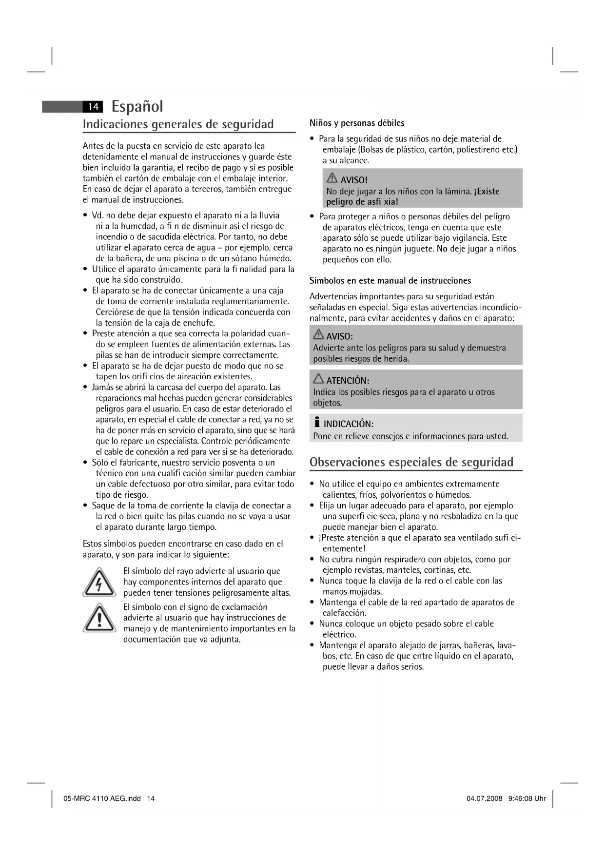 - Mantenga el aparato alejado de jarras, bañeras, lava- bos, etc. En caso de que entre líquido en el aparato, puede llevar a daños serios. 05-MRC 4110 AEG.indd 1405-MRC 4110 AEG.indd 14 04.07.2008 9:46:08 Uhr04.07.2008 9:46:08 UhrEspañol