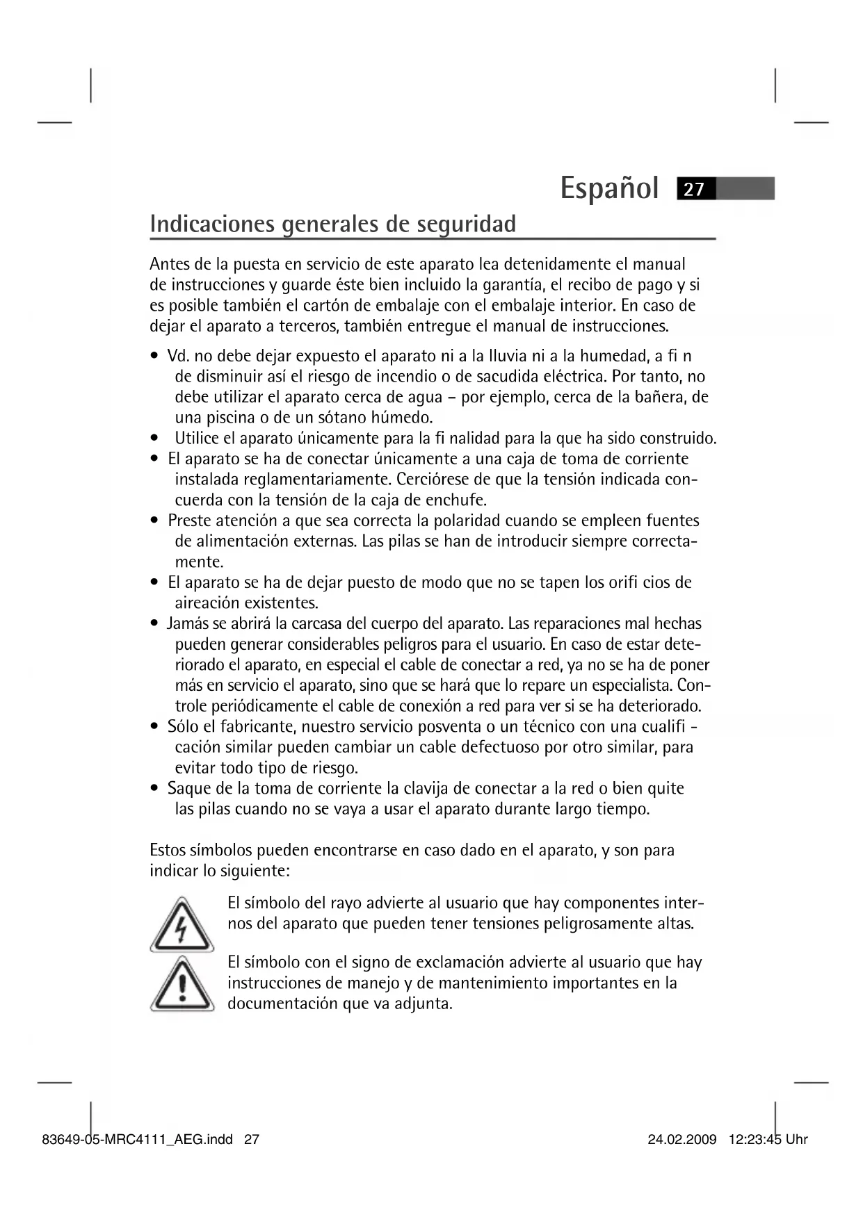 - Saque de la toma de corriente la clavija de conectar a la red o bien quite las pilas cuando no se vaya a usar el aparato durante largo tiempo. Estos símbolos pueden encontrarse en caso dado en el aparato, y son para indicar lo siguiente: El símbolo del rayo advierte al usuario que hay componentes inter- nos del aparato que pueden tener tensiones peligrosamente altas. El símbolo con el signo de exclamación advierte al usuario que hay instrucciones de manejo y de mantenimiento importantes en la documentación que va adjunta. 83649-05-MRC4111_AEG.indd 2783649-05-MRC4111_AEG.indd 27 24.02.2009 12:23:45 Uhr24.02.2009 12:23:45 UhrEspañol