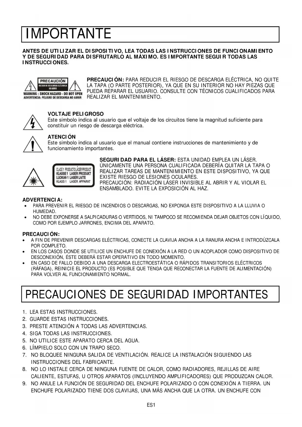 VOLTAJE PELIGROSO Este símbolo indica al usuario que el voltaje de los circuitos tiene la magnitud suficiente para constituir un riesgo de descarga eléctrica. ATENCIÓN Este símbolo indica al usuario que el manual contiene instrucciones de mantenimiento y de funcionamiento importantes. SEGURIDAD PARA EL LÁSER: ESTA UNIDAD EMPLEA UN LÁSER. ÚNICAMENTE UNA PERSONA CUALIFICADA DEBERÍA QUITAR LA TAPA O REALIZAR TAREAS DE MANTENIMIENTO EN ESTE DISPOSITIVO, YA QUE EXISTE RIESGO DE LESIONES OCULARES. PRECAUCIÓN: RADIACIÓN LÁSER INVISIBLE AL ABRIR Y AL VIOLAR EL ENSAMBLADO. EVITE LA EXPOSICIÓN AL HAZ. ADVERTENCIA: