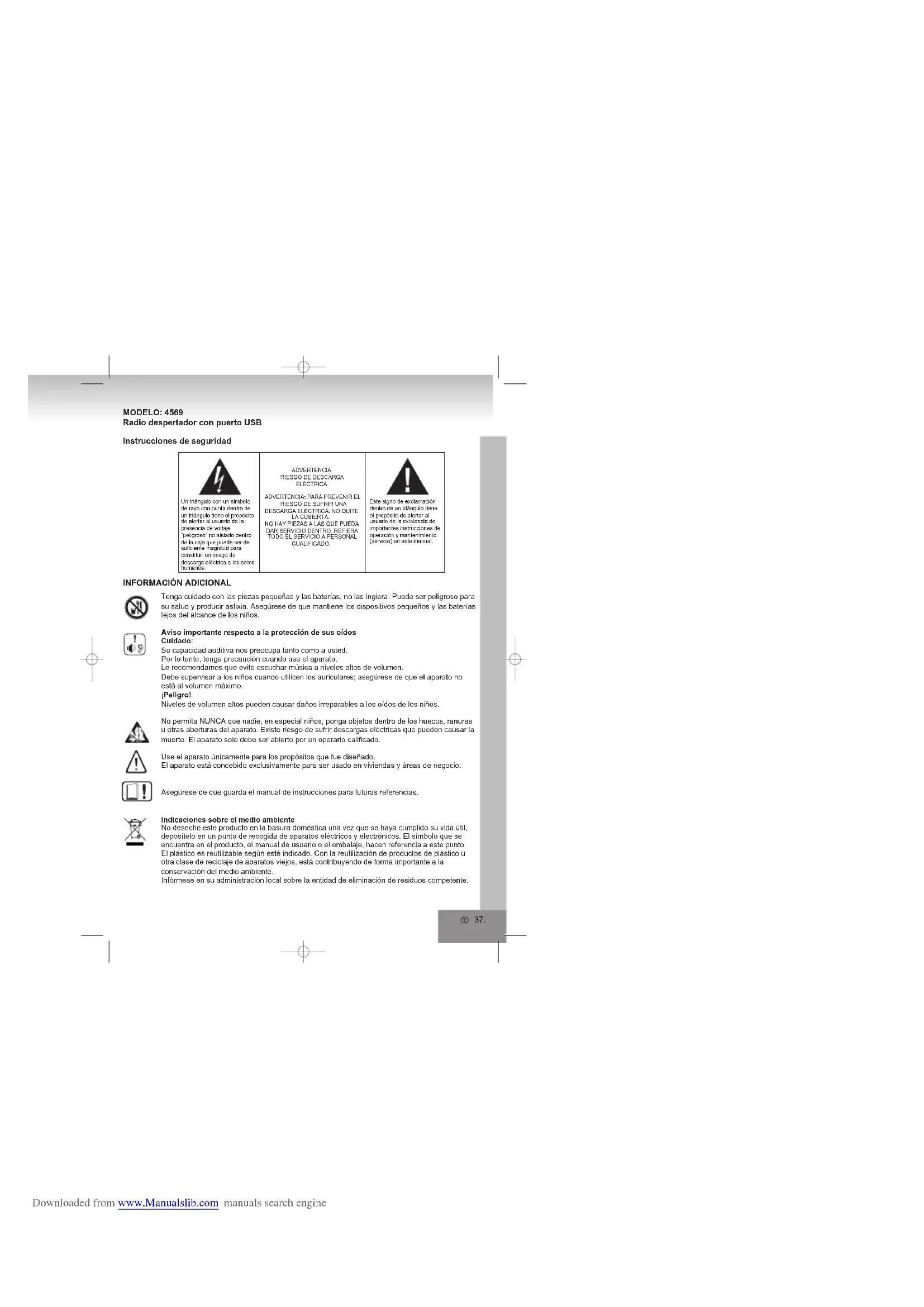 ADVERTENCIARIESGO DE DESCARGA ELÉCTRICAADVERTENCIA: PARA PREVENIR EL RIESGO DE SUFRIR UNA DESCARGA ELÉCTRICA, NO QUITE LA CUBIERTA. NO HAY PIEZAS A LAS QUE PUEDA DAR SERVICIO DENTRO. REFIERA TODO EL SERVICIO A PERSONAL CUALIFICADO. Downloaded from www.Manualslib.com manuals search engineNo impida la ventilación del aparato. Asegúrese, que cortinas, periódicos, manteles o muebles no estén bloqueando las ranuras de ventilación del aparato. ¡Se debe asegurar una ventilación correcta todo el tiempo! El sobrecalentamiento puede causar serios daños en el interior del aparato, provocando problemas de funcionamiento y acortando el tiempo de vida útil del producto.CalorNo exponga el aparato a la luz solar directa. Asegúrese que el aparato no esta expuesto directa-mente a Fuentes de calor como calefactores o fuego. Asegúrese que las ranuras de ventilación del aparato no esté n cubiertas.Humedad y limpieza¡Este aparato no es resistente al agua! No sumerja la unidad en agua. No permita que la unidad entre en contacto con el agua. Si el agua entra en ella puede provocar daños serios.No use agentes de limpieza que contengan alcohol, amoniaco, benceno o abrasivos ya que pueden dañar la unidad. Para limpiarlo use un paño suave ligeramente humedecido.Reciclaje profesionalNo deseche las pilas ni el material de embalaje con la basura doméstica. Las pilas deben ser recogidas por el personal del centro recolector de baterías usadas. Desechar separadamente los materiales de embalaje es de gran ayuda para el medio ambiente.