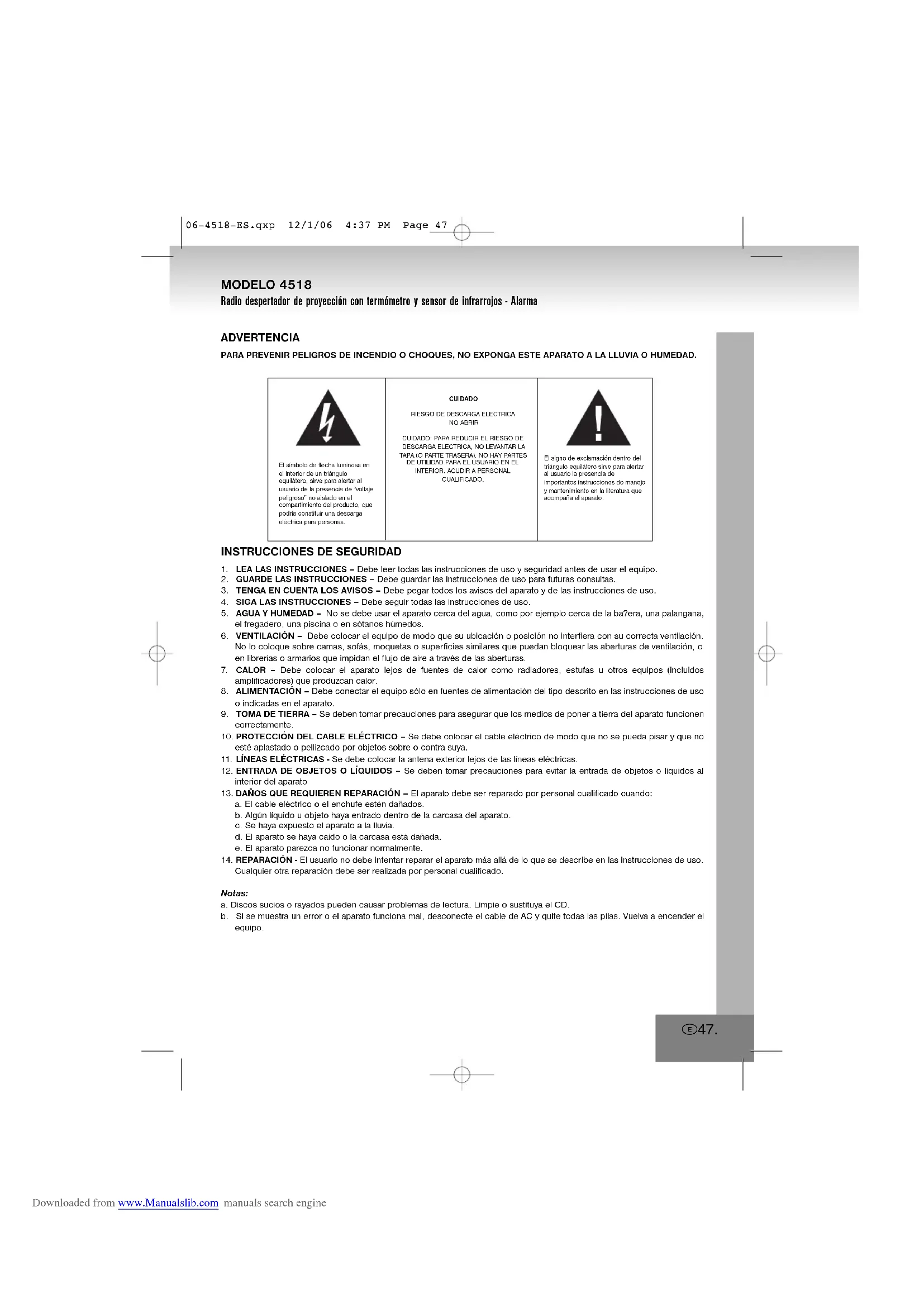a. El cable eléctrico o el enchufe estén dañados.b. Algún líquido u objeto haya entrado dentro de la carcasa del aparato.c. Se haya expuesto el aparato a la lluvia.d. El aparato se haya caído o la carcasa está dañada.e. El aparato parezca no funcionar normalmente. 14. REPARACIÓN - El usuario no debe intentar reparar el aparato más allá de lo que se describe en las instrucciones de uso. Cualquier otra reparación debe ser realizada por personal cualificado.Notas:a. Discos sucios o rayados pueden causar problemas de lectura. Limpie o sustituya el CD. b. Si se muestra un error o el aparato funciona mal, desconecte el cable de AC y quite todas las pilas. Vuelva a encender el equipo. E 47. El símbolo de flecha luminosa enel interior de un triánguloequilátero, sirve para alertar alusuario de la presencia de “voltajepeligroso” no aislado en elcompartimiento del producto, quepodría constituir una descargaeléctrica para personas.CUIDADORIESGO DE DESCARGA ELECTRICANO ABRIRCUIDADO: PARA REDUCIR EL RIESGO DEDESCARGA ELECTRICA, NO LEVANTAR LATAPA (O PARTE TRASERA). NO HAY PARTESDE UTILIDAD PARA EL USUARIO EN ELINTERIOR. ACUDIR A PERSONALCUALIFICADO.El signo de exclamación dentro deltriángulo equilátero sirve para alertaral usuario la presencia deimportantes instrucciones de manejoy mantenimiento en la literatura queacompaña el aparato. MODELO 4518 Radio despertador de proyección con termómetro y sensor de infrarrojos - Alarma 06-4518-ES.qxp 12/1/06 4:37 PM Page 47 Downloaded from www.Manualslib.com manuals search engineE 48. CONTROLES 1. BOTÓN AJUSTAR MODO2. BOTÓN AJUSTAR ALARMA3. BOTÓN ALARMA 1 / SELECCIONAR RADIO4. BOTÓN ALARMA 2 / SELECCIONAR RADIO5. BOTÓN Cº / Fº6. SENSOR INFRARROJO7. BOTÓN AJUSTE 8. BOTÓN AJUSTE 9. BOTÓN ENCENDIDO/APAGADO (ALARMADESACTIVADA)10. BOTÓN DORMITAR / DORMIR11. INDICADOR LED12. ESCALA DEL DIAL Y MARCADOR13. TOMA DE ENTRADA DE AUDIO14. CONTROL DE VOLUMEN15. BANDA DE ONDAS16. CONTROL DE SINTONÍA17. BOTÓN REINICIAR18. SENSOR DE TEMPERATURA (INTERIOR)19. CABLE DE ALIMENTACIÓN AC20.ANTENA FM21. ETIQUETA DE VALORACIÓN22.COMPARTIMIENTO PARA PILAS23.ALTAVOZ24. BOTÓN MINUTO PARA EL EQUIPO DE PROYECCIÓN25.BOTÓN HORA PARA EL EQUIPO DE PROYECCIÓN26.BOTÓN AJUSTAR HORA PARA EL EQUIPO DEPROYECCIÓN27. AJUSTE DEL FOCO DEL EQUIPO DE PROYECCIÓN28.PROYECCIÓN HABILITADO/DESHABILITADO29.EQUIPO DE PROYECCIÓN30.SENSOR AUTOMÁTICO DEL REGULADOR DEVOLTAJE 06-4518-ES.qxp 12/1/06 4:37 PM Page 48 Downloaded from www.Manualslib.com manuals search engineALIMENTACIÓN Enchufe el cable AC a una toma de corriente AC. Este equipo está equipado con un sistema de recuperación a pilas, que requiere 3 pilas panas de litio 3V CR2025 (no incluidas). Ponga las pilas en el compartimiento para pilas, comprobando que los terminales positivo y negativo (+ y -) de la pila estén en contacte con los terminales correspondientes de la placa en el compartimiento para pilas. Si hay algún fallo en la alimentación AC, el reloj cambiará automáticamente a alimentación por pilas. El reloj y la memoria del temporizador continúan funcionando. Cuando se recupera la alimentación AC, el reloj vuelve aalimentación AC. EMPEZAR Pulse Reiniciar (17), en la parte posterior del equipo, después de enchufar la alimentación AC. Se mostrarán todos los segmentos durante 2 segundos, después de los cuales se entrará al modo normal. Se encenderá el indicador.