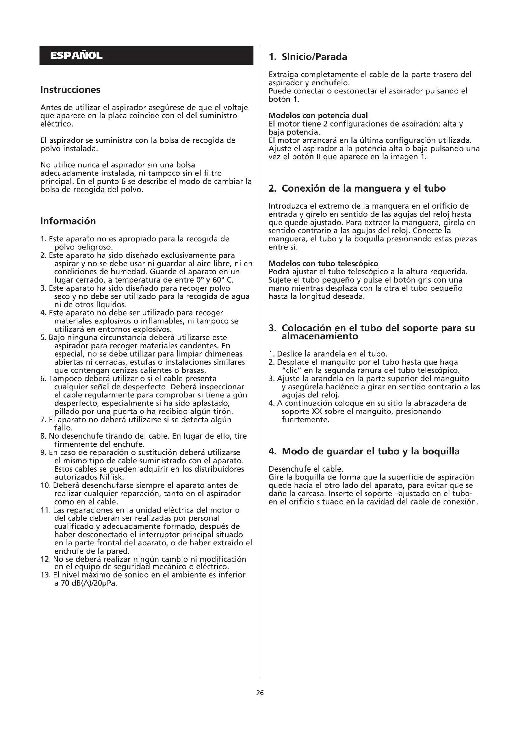 - Si se para el aspirador – El fusible térmico ha desconectado el motor como resultado de un bloqueo en la manguera, el tubo o la boquilla. Elimine la causa del bloqueo y el aspirador arrancará automáticamente al cabo de poco. Mantenimiento Guarde el aspirador en un sitio seco. El aspirador no precisa lubricación. El aspirador ha sido diseñado para un trabajo prolongado y exigente, pero en su momento, y dependiendo de la utilización que se le dé, deberá sustituir los filtros. Limpie la superficie del aspirador utilizando un paño seco y, si es necesario, con un poco de limpiador. Servicio – contacte con su distribuidor local.29 Instruções Antes de utilizar a máquina, certifique-se de que a frequência e a tensão indicadas na chapa de identificação correspondem à potência de alimentação. O aspirador é fornecido já com um saco instalado. Nunca utilize o aspirador sem um saco correctamente instalado e sem o filtro principal. Veja como mudar o saco no Ponto 6. Informações importantes