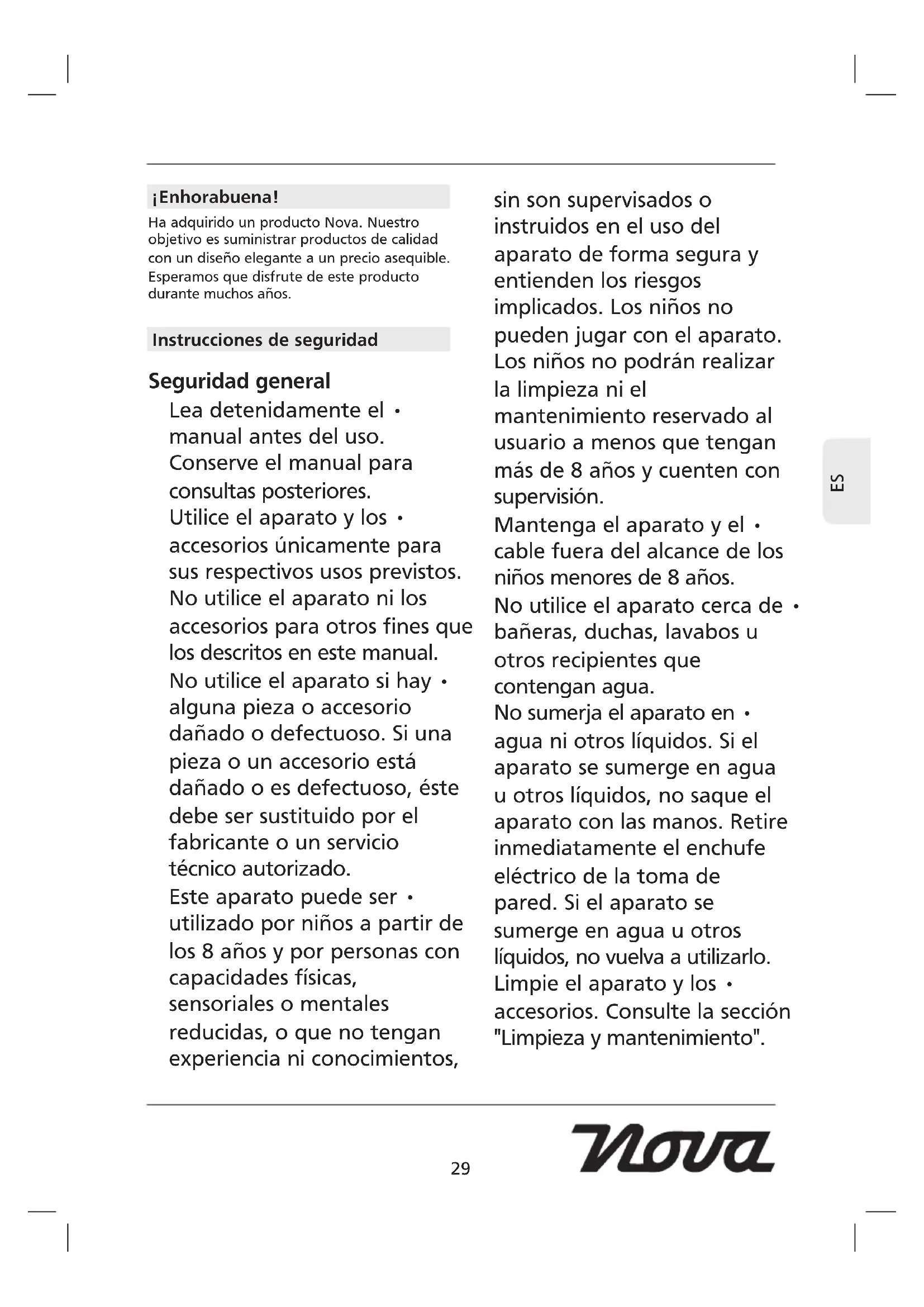 ¡Enhorabuena! Ha adquirido un producto Nova. Nuestro objetivo es suministrar productos de calidad con un diseño elegante a un precio asequible. Esperamos que disfrute de este producto durante muchos años. Instrucciones de seguridad Seguridad general Lea detenidamente el • manual antes del uso. Conserve el manual para consultas posteriores. Utilice el aparato y los • accesorios únicamente para sus respectivos usos previstos. No utilice el aparato ni los accesorios para otros fines que los descritos en este manual. No utilice el aparato si hay • alguna pieza o accesorio dañado o defectuoso. Si una pieza o un accesorio está dañado o es defectuoso, éste debe ser sustituido por el fabricante o un servicio técnico autorizado. Este aparato puede ser • utilizado por niños a partir de los 8 años y por personas con capacidades físicas, sensoriales o mentales reducidas, o que no tengan experiencia ni conocimientos, sin son supervisados o instruidos en el uso del aparato de forma segura y entienden los riesgos implicados. Los niños no pueden jugar con el aparato. Los niños no podrán realizar la limpieza ni el mantenimiento reservado al usuario a menos que tengan más de 8 años y cuenten con supervisión. Mantenga el aparato y el • cable fuera del alcance de los niños menores de 8 años. No utilice el aparato cerca de • bañeras, duchas, lavabos u otros recipientes que contengan agua. No sumerja el aparato en • agua ni otros líquidos. Si el aparato se sumerge en agua u otros líquidos, no saque el aparato con las manos. Retire inmediatamente el enchufe eléctrico de la toma de pared. Si el aparato se sumerge en agua u otros líquidos, no vuelva a utilizarlo. Limpie el aparato y los • accesorios. Consulte la sección "Limpieza y mantenimiento".30