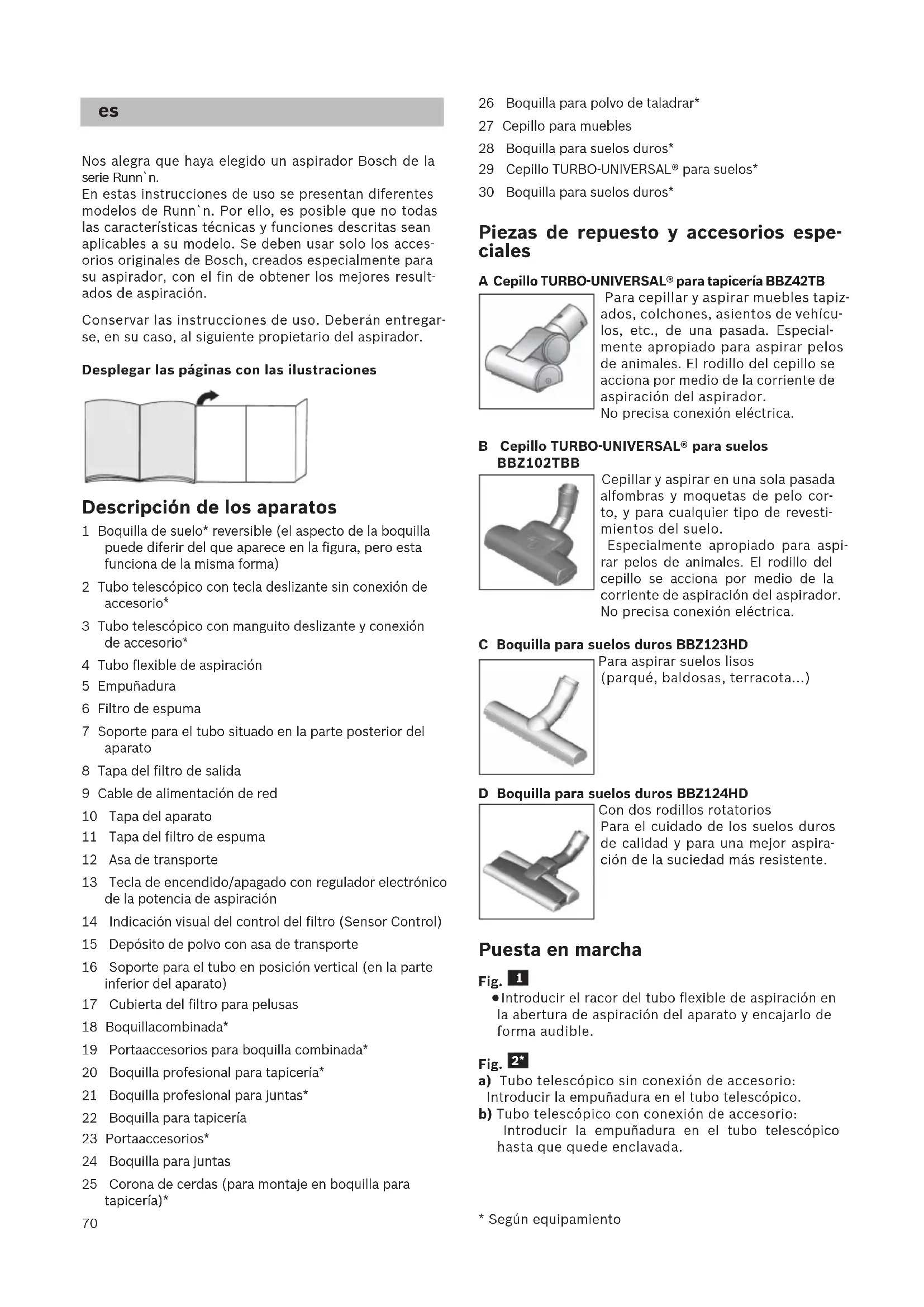 - mallista riippuen70 Nos alegra que haya elegido un aspirador Bosch de la serie Runn`n. En estas instrucciones de uso se presentan diferentes modelos de Runn`n. Por ello, es posible que no todas las características técnicas y funciones descritas sean aplicables a su modelo. Se deben usar solo los acces- orios originales de Bosch, creados especialmente para su aspirador, con el fin de obtener los mejores result- ados de aspiración. Conservar las instrucciones de uso. Deberán entregar- se, en su caso, al siguiente propietario del aspirador. Desplegar las páginas con las ilustraciones Descripción de los aparatos 1 Boquilla de suelo* reversible (el aspecto de la boquilla puede diferir del que aparece en la figura, pero esta funciona de la misma forma) 2 Tubo telescópico con tecla deslizante sin conexión de accesorio* 3 Tubo telescópico con manguito deslizante y conexión de accesorio* 4 Tubo flexible de aspiración 5 Empuñadura 6 Filtro de espuma 7 Soporte para el tubo situado en la parte posterior del aparato 8 Tapa del filtro de salida 9 Cable de alimentación de red 10 Tapa del aparato 11 Tapa del filtro de espuma 12 Asa de transporte 13 Tecla de encendido/apagado con regulador electrónico de la potencia de aspiración 14 Indicación visual del control del filtro (Sensor Control) 15 Depósito de polvo con asa de transporte 16 Soporte para el tubo en posición vertical (en la parte inferior del aparato) 17 Cubierta del filtro para pelusas 18 Boquilla combinada* 19 Portaaccesorios para boquilla combinada* 20 Boquilla profesional para tapicería* 21 Boquilla profesional para juntas* 22 Boquilla para tapicería 23 Portaaccesorios* 24 Boquilla para juntas 25 Corona de cerdas (para montaje en boquilla para tapicería)* 26 Boquilla para polvo de taladrar* 27 Cepillo para muebles 28 Boquilla para suelos duros* 29 Cepillo TURBO-UNIVERSAL® para suelos* 30 Boquilla para suelos duros* Piezas de repuesto y accesorios espe- ciales A Cepillo TURBO-UNIVERSAL® para tapicería BBZ42TB Para cepillar y aspirar muebles tapiz- ados, colchones, asientos de vehícu- los, etc., de una pasada. Especial- mente apropiado para aspirar pelos de animales. El rodillo del cepillo se acciona por medio de la corriente de aspiración del aspirador. No precisa conexión eléctrica. B Cepillo TURBO-UNIVERSAL® para suelos BBZ102TBB Cepillar y aspirar en una sola pasada alfombras y moquetas de pelo cor- to, y para cualquier tipo de revesti- mientos del suelo. Especialmente apropiado para aspi- rar pelos de animales. El rodillo del cepillo se acciona por medio de la corriente de aspiración del aspirador. No precisa conexión eléctrica. C Boquilla para suelos duros BBZ123HD Para aspirar suelos lisos (parqué, baldosas, terracota...) D Boquilla para suelos duros BBZ124HD Con dos rodillos rotatorios Para el cuidado de los suelos duros de calidad y para una mejor aspira- ción de la suciedad más resistente. Puesta en marcha Fig.