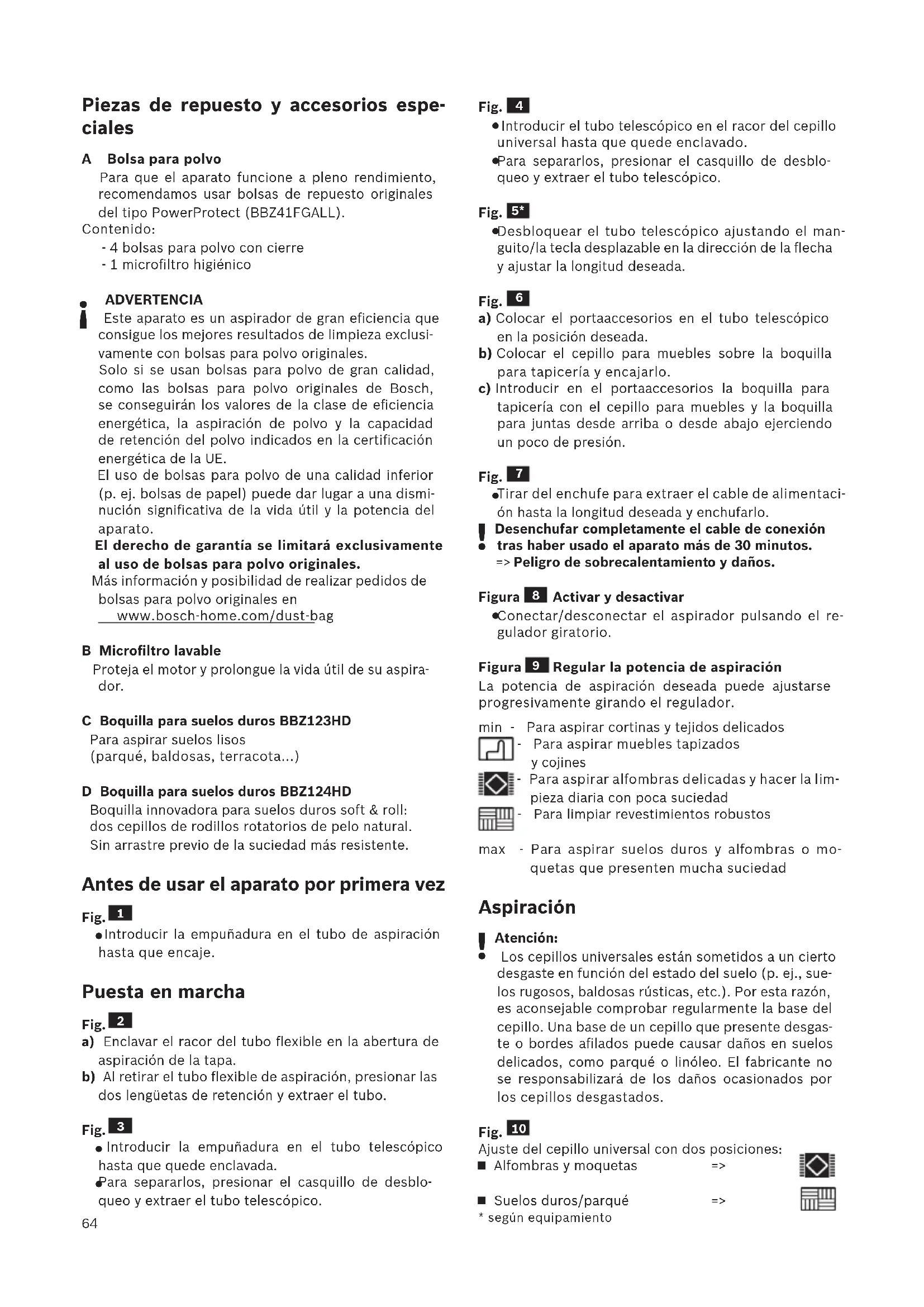 ADVERTENCIA Este aparato es un aspirador de gran eficiencia que consigue los mejores resultados de limpieza exclusi- vamente con bolsas para polvo originales. Solo si se usan bolsas para polvo de gran calidad, como las bolsas para polvo originales de Bosch, se conseguirán los valores de la clase de eficiencia energética, la aspiración de polvo y la capacidad de retención del polvo indicados en la certificación energética de la UE. El uso de bolsas para polvo de una calidad inferior (p. ej. bolsas de papel) puede dar lugar a una dismi- nución significativa de la vida útil y la potencia del aparato. El derecho de garantía se limitará exclusivamente al uso de bolsas para polvo originales. Más información y posibilidad de realizar pedidos de bolsas para polvo originales en www.bosch-home.com/dust-bag B Microfiltro lavable Proteja el motor y prolongue la vida útil de su aspira- dor. C Boquilla para suelos duros BBZ123HD Para aspirar suelos lisos (parqué, baldosas, terracota...) D Boquilla para suelos duros BBZ124HD Boquilla innovadora para suelos duros soft & roll: dos cepillos de rodillos rotatorios de pelo natural. Sin arrastre previo de la suciedad más resistente. Antes de usar el aparato por primera vez Fig.