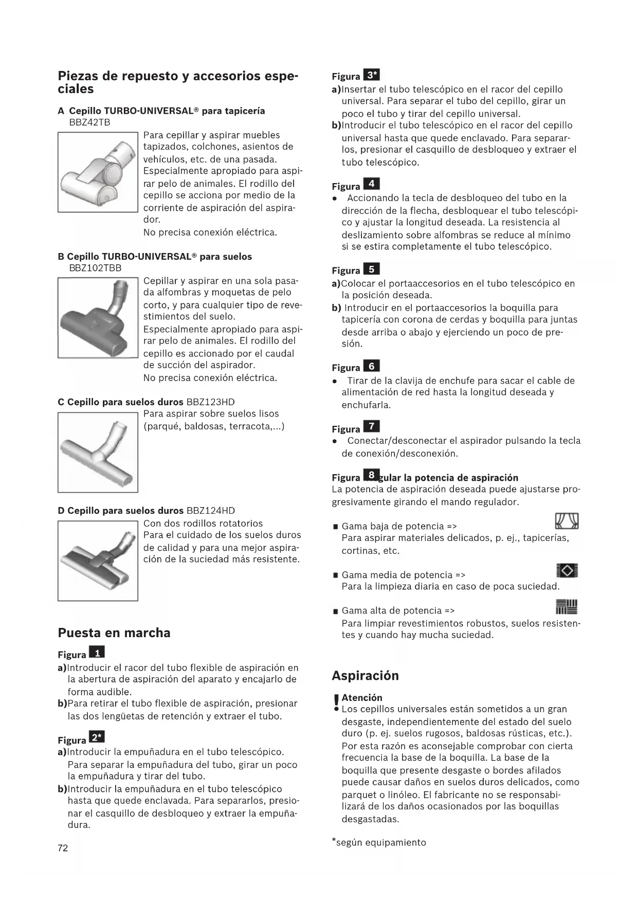 BZ102TBB Cepillar y aspirar en una sola pasa- da alfombras y moquetas de pelo corto, y para cualquier tipo de reve- stimientos del suelo. Especialmente apropiado para aspi- rar pelo de animales. El rodillo del cepillo es accionado por el caudal de succión del aspirador. No precisa conexión eléctrica. C Cepillo para suelos duros BBZ123HD Para aspirar sobre suelos lisos (parqué, baldosas, terracota,...) D Cepillo para suelos duros BBZ124HD Con dos rodillos rotatorios Para el cuidado de los suelos duros de calidad y para una mejor aspira- ción de la suciedad más resistente. Puesta en marcha Figura a)Introducir el racor del tubo flexible de aspiración en la abertura de aspiración del aparato y encajarlo de forma audible. b)Para retirar el tubo flexible de aspiración, presionar las dos lengüetas de retención y extraer el tubo. Figura a)Introducir la empuñadura en el tubo telescópico. Para separar la empuñadura del tubo, girar un poco la empuñadura y tirar del tubo. b)Introducir la empuñadura en el tubo telescópico hasta que quede enclavada. Para separarlos, presio- nar el casquillo de desbloqueo y extraer la empuña- dura.