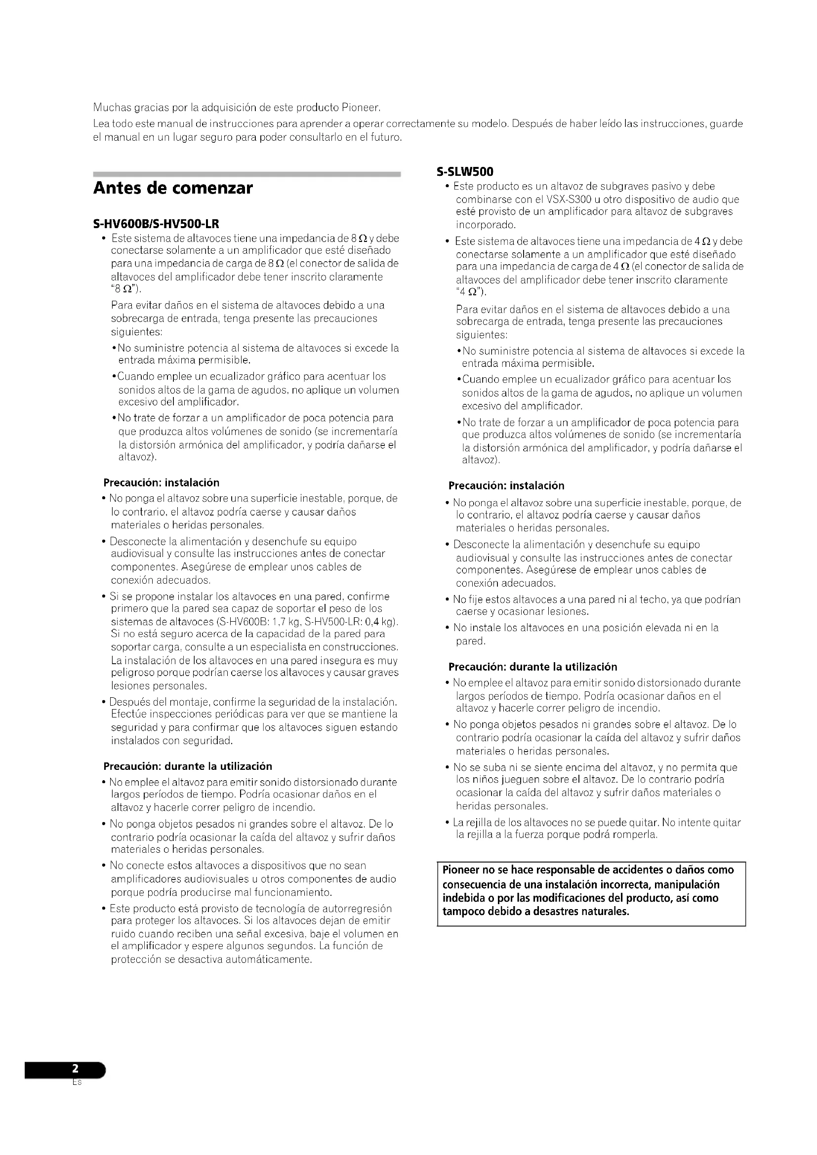Muchas gracias por la adquisición de este producto Pioneer. Lea todo este manual de instrucciones para aprender a operar correctamente su modelo. Después de haber leído las instrucciones, guarde el manual en un lugar seguro para poder consultarlo en el futuro. Antes de comenzar S-HV600B/S-HV500-LR