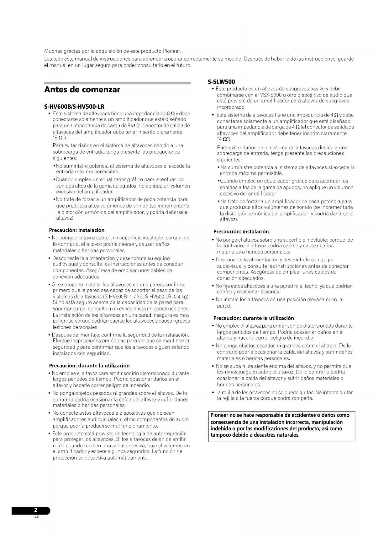 - La rejilla de los altavoces no se puede quitar. No intente quitar la rejilla a la fuerza porque podrá romperla. Pioneer no se hace responsable de accidentes o daños como consecuencia de una instalación incorrecta, manipulación indebida o por las modificaciones del producto, así como tampoco debido a desastres naturales. S-HV600B_S-HV500-LR_En.fm 2 ページ 2011年4月12日 火曜日 午後5時21分3
