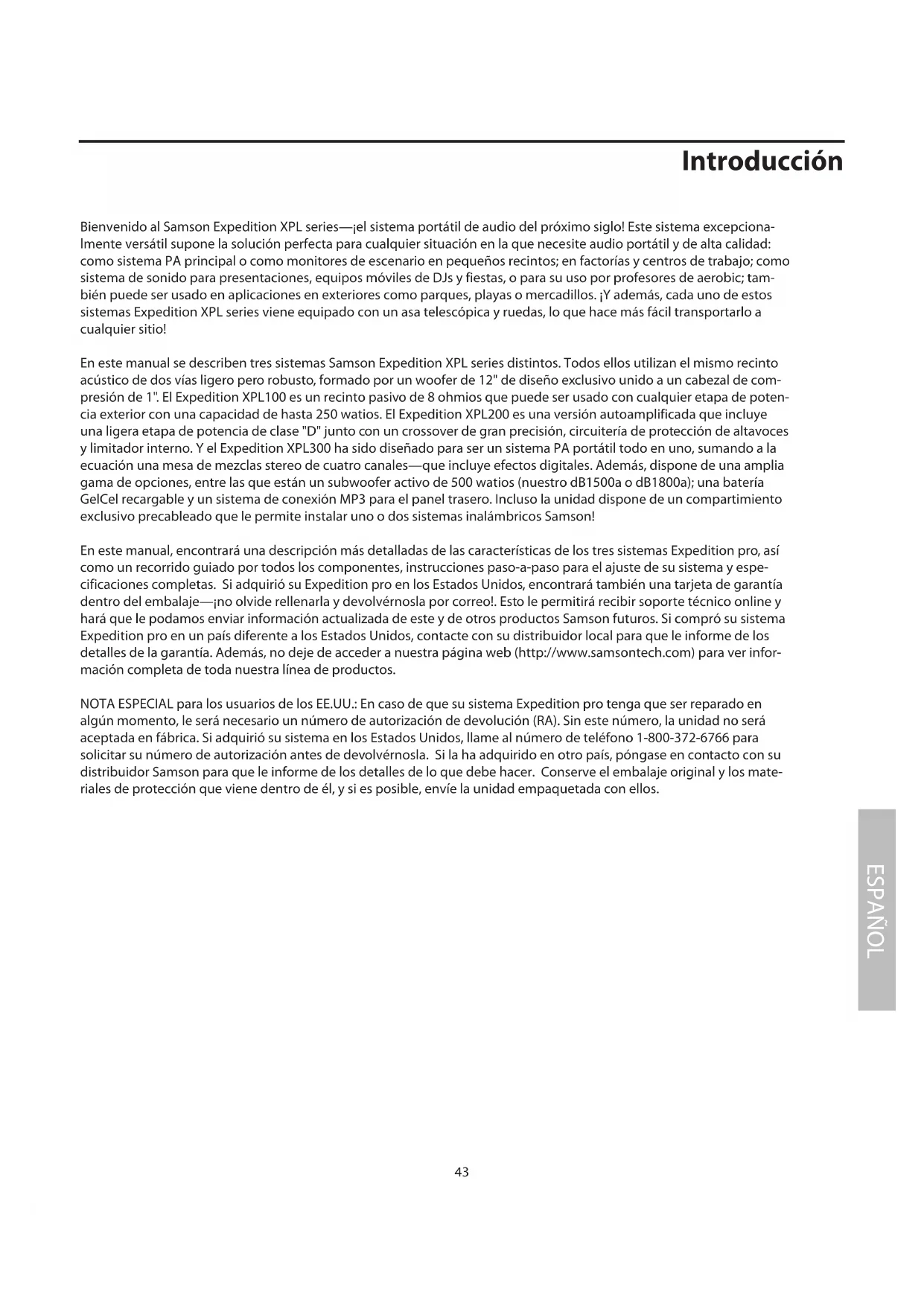 En este manual se describen tres sistemas Samson Expedition XPL series distinctos. Todlos ellos realizan el mesmo recinto acustico de dos vias ligero pero robusto, formado por un woofer de 12" de diseño exclusivo unido a un cabezal de compresión de 1". El Expedition XPL100 es un recinto pasivo de 8 ohmios que pueda ser usa conrialquier etapa de potencia exterior con una capacité de hasta 250 watos. El Expedition XPL200 es una version autoamplificada que incluye una liga eta de potencia de类产品 "D" junto con un crossover de gran precision, circuiteria de proteccion de altavoces y limitador interno. Y el Expedition XPL300 ha sido done para ser un systema PA porttil todo en uno, sumando a la ecuacion una mesa de mezclas stereo de quatre canales--que incluye efectos digitales. Ademas, dispone de una amplia gama de options, entre las que estan un subwoofer activo de 500 watos (nuestro dB1500a o dB1800a); una bateria GelCel recargable y un systema de connexion MP3 para el panel trasero. Incluso launidad dispone de un compartmento exclusivo precableado que le permite instalar uno o dos sistemas inalambricos Samson!