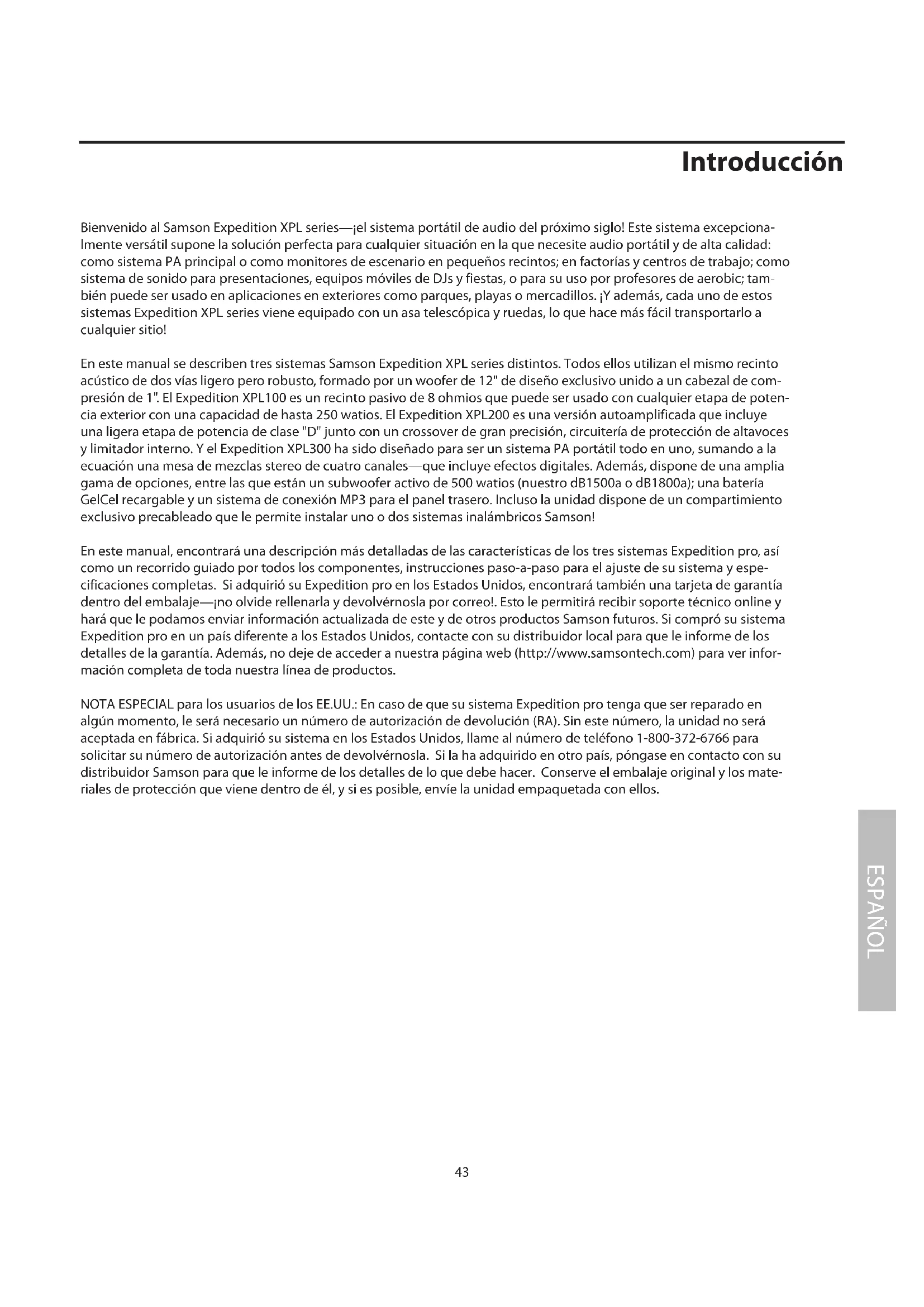 NOTA ESPECIAL para los usuario de los EE.UU.: En caso de que su sistemas Expedition proonga que ser reparado en某个 momento, le seranecessary un numero de autorizacion de devoluncion (RA).Sin este numero,la Unidad no sera aceptada en fabrica. Si adquirido su sistemas en los Estados Unidos, Ilame al numero de téléphone 1-800-372-6766 para solicitar su numero de autorizacion antes de devolvernosla. Si la ha adquirido en other pais,pongase en contacto con su distribuidor Samson para que le informe de los detalles de lo que debe hacer.Conserve el embalaje original y los materiales de proteccion que viene bajo el, y si es possible, envie la unidad empaquetada con ellos.