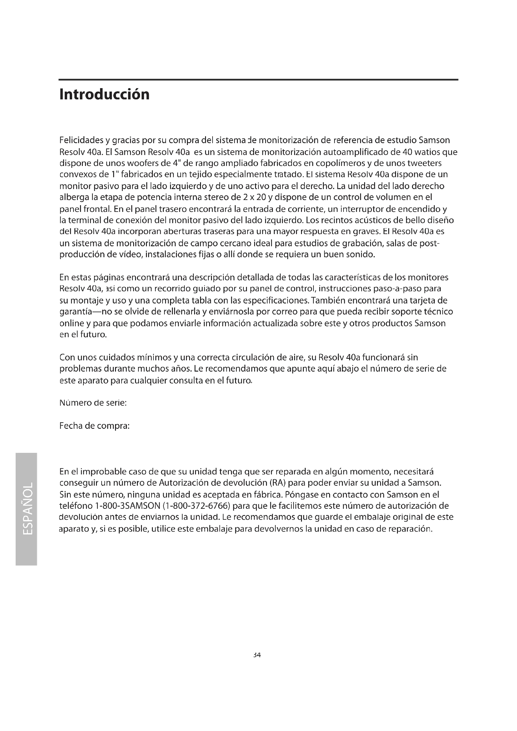 En estas páginasañtra una descripción detallada de todas las característica de los monitores Resolv 40a, asi como un recorro guiado por su panel de control, instructaciones paso-a-paso para su montaje y uso y una completenessa tabla con las specifications. también funciona una tarjeta de garantía—no se olvide de relllenarla y enviárnosla por correto para que pueda recibir soporte técnico online y para que podamos enviarle información actualizada sobre este y otros productos Samson en el futuro.