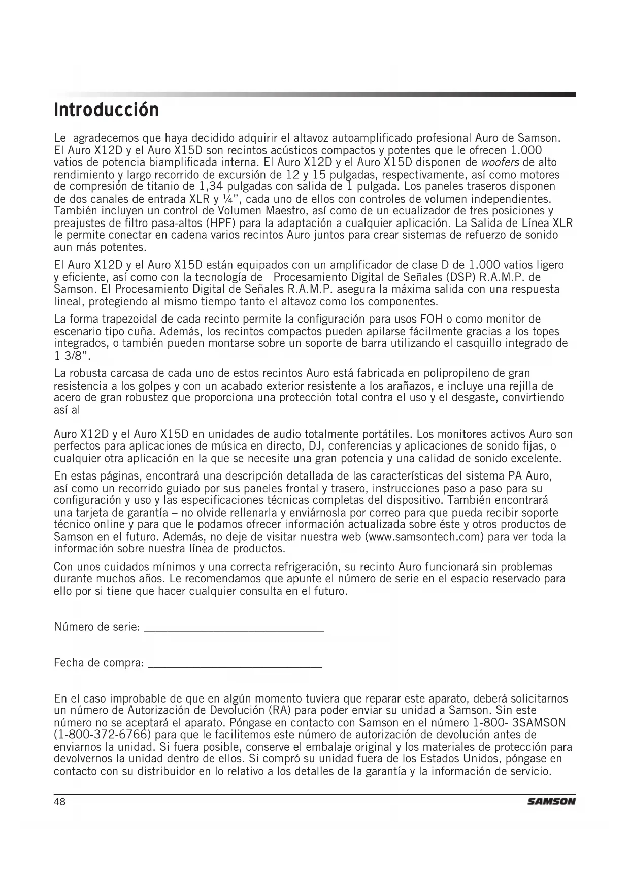 En estas páginas, encontrará una descripción detallada de las características del sistema PA Auro, así como un recorrido guiado por sus paneles frontal y trasero, instrucciones paso a paso para su configuración y uso y las especificaciones técnicas completas del dispositivo. También encontrará una tarjeta de garantía – no olvide rellenarla y enviárnosla por correo para que pueda recibir soporte técnico online y para que le podamos ofrecer información actualizada sobre éste y otros productos de Samson en el futuro. Además, no deje de visitar nuestra web (www.samsontech.com) para ver toda la información sobre nuestra línea de productos.