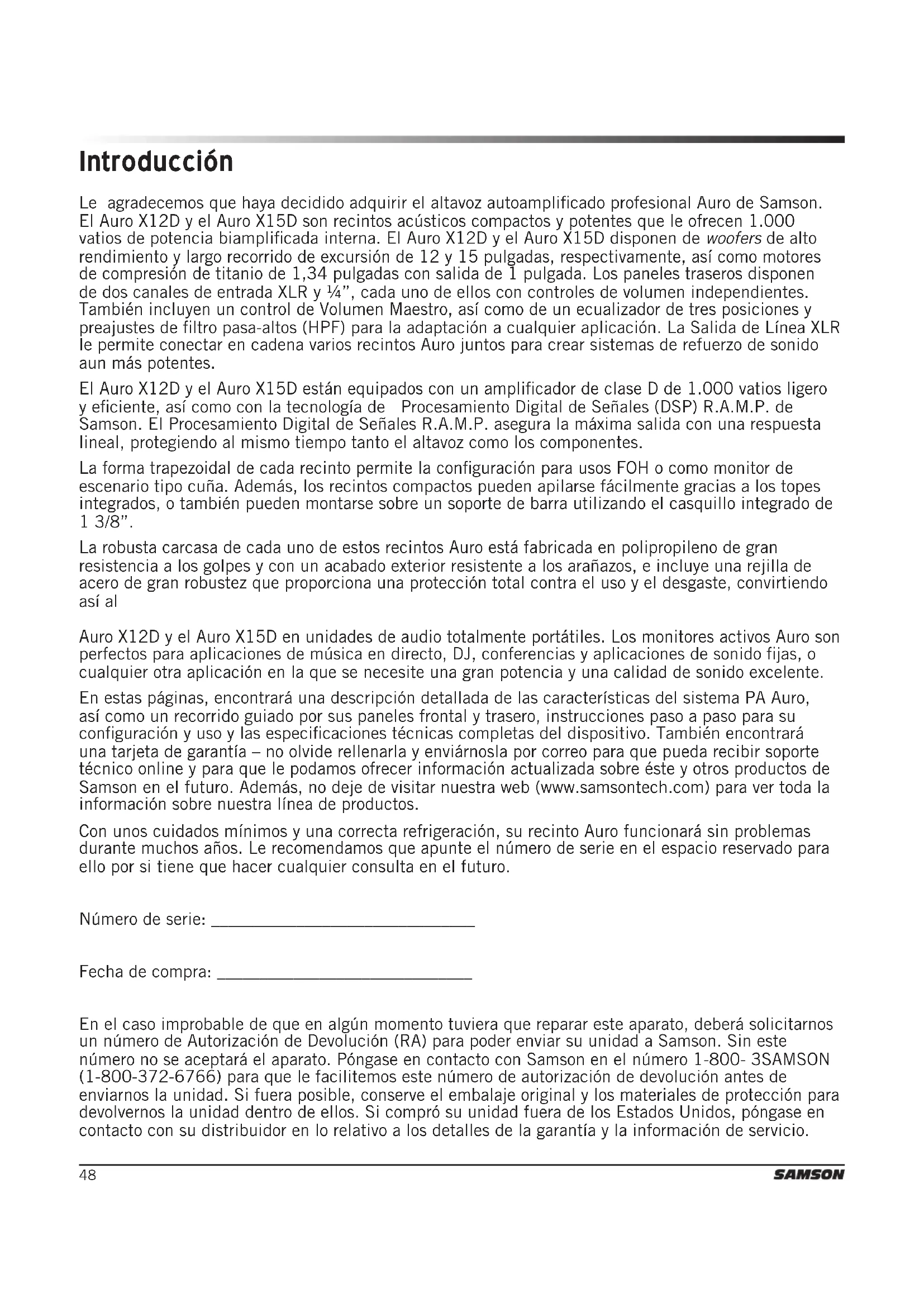 En estas páginas, encontrará una descripción detallada de las característica del sistema PA Auro, asi como un recorrodo guiado por sus paneles frontal y trasero, instructaciones bajo para su configuración y uso y las specificationséticas completas del dispositivo. también encontrará una tarjeta de garantía – no olvade relllenarla y enviárnosla por correto para que pueda recibir soporte técnico online y para que le podamos-ofrecer información actualizada sobre este y otros productos de Samson en el futuro. Además, no deje de visitar nuestra web (www.samsontech.com) para ver toda la información sobre这是我们 linea de produits.