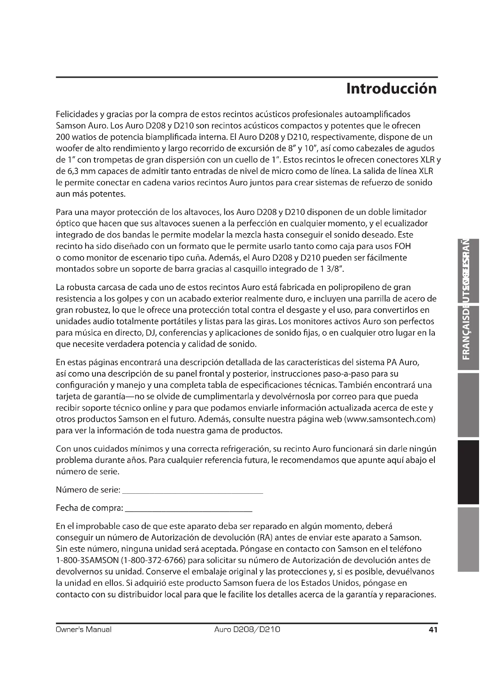 En estas páginasas encontrará una descripción detallada de las característica del sistema PA Auro, como una descripción de su panel frontal y posterior, instrucciones paso-a-paso para su configuración y manejo y una completenessa tabla de specifications痫icas. también inclararuna tarjeta de garantía—no se olvide de complimentarla y devolvénosla por correo para que pueda recibir soporte的技术ico online y para que podamos enviarle informacionactualiza acerca de este y otros productos Samson en el futuro. Además, consulte notrestra网页 (www.samsontech.com) para ver la informacion de toda这是我们 gama de productos.
