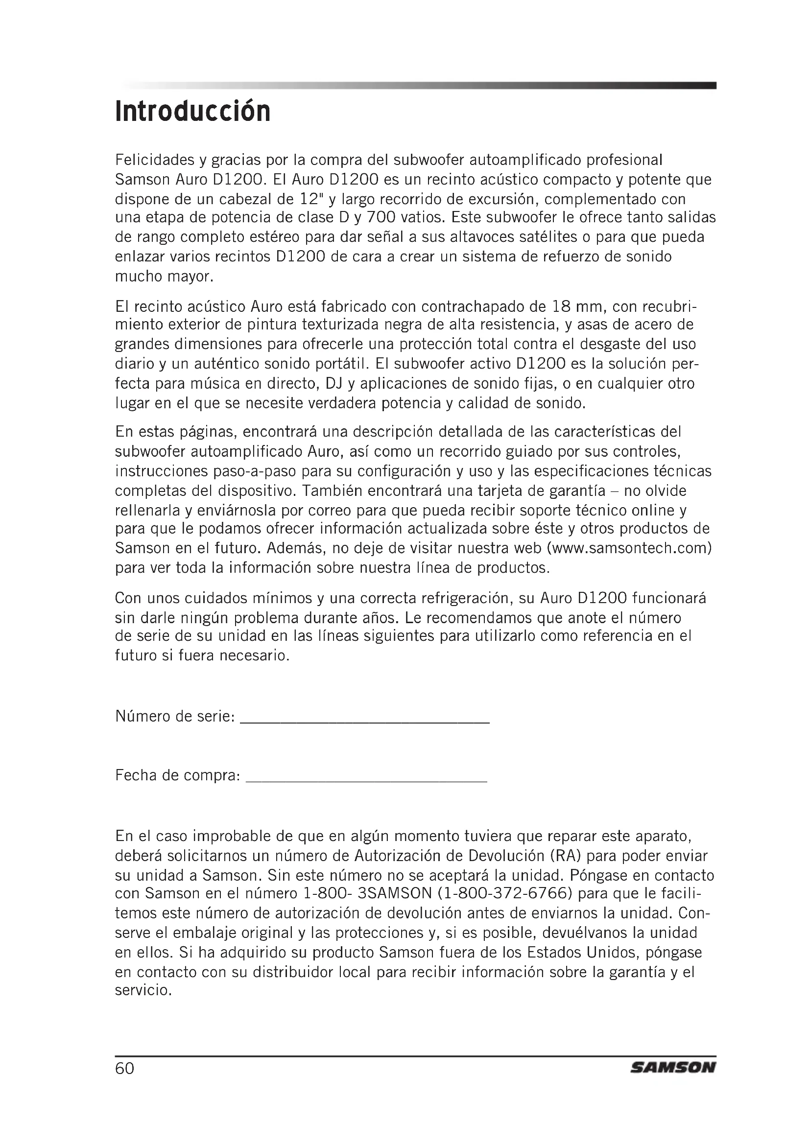 - Especicaciones Subwoofer Activo Auro D1200 59Felicidades y gracias por la compra del subwoofer autoamplificado profesional Samson Auro D1200. El Auro D1200 es un recinto acústico compacto y potente que dispone de un cabezal de 12" y largo recorrido de excursión, complementado con una etapa de potencia de clase D y 700 vatios. Este subwoofer le ofrece tanto salidas de rango completo estéreo para dar señal a sus altavoces satélites o para que pueda enlazar varios recintos D1200 de cara a crear un sistema de refuerzo de sonido mucho mayor. El recinto acústico Auro está fabricado con contrachapado de 18 mm, con recubri- miento exterior de pintura texturizada negra de alta resistencia, y asas de acero de grandes dimensiones para ofrecerle una protección total contra el desgaste del uso diario y un auténtico sonido portátil. El subwoofer activo D1200 es la solución per- fecta para música en directo, DJ y aplicaciones de sonido fijas, o en cualquier otro lugar en el que se necesite verdadera potencia y calidad de sonido. En estas páginas, encontrará una descripción detallada de las características del subwoofer autoamplificado Auro, así como un recorrido guiado por sus controles, instrucciones paso-a-paso para su configuración y uso y las especificaciones técnicas completas del dispositivo. También encontrará una tarjeta de garantía – no olvide rellenarla y enviárnosla por correo para que pueda recibir soporte técnico online y para que le podamos ofrecer información actualizada sobre éste y otros productos de Samson en el futuro. Además, no deje de visitar nuestra web (www.samsontech.com) para ver toda la información sobre nuestra línea de productos. Con unos cuidados mínimos y una correcta refrigeración, su Auro D1200 funcionará sin darle ningún problema durante años. Le recomendamos que anote el número de serie de su unidad en las líneas siguientes para utilizarlo como referencia en el futuro si fuera necesario. Número de serie: _______________________________ Fecha de compra: ______________________________ En el caso improbable de que en algún momento tuviera que reparar este aparato, deberá solicitarnos un número de Autorización de Devolución (RA) para poder enviar su unidad a Samson. Sin este número no se aceptará la unidad. Póngase en contacto con Samson en el número 1-800- 3SAMSON (1-800-372-6766) para que le facili- temos este número de autorización de devolución antes de enviarnos la unidad. Con- serve el embalaje original y las protecciones y, si es posible, devuélvanos la unidad en ellos. Si ha adquirido su producto Samson fuera de los Estados Unidos, póngase en contacto con su distribuidor local para recibir información sobre la garantía y el servicio. Introducción 60ENGLISH p. 73