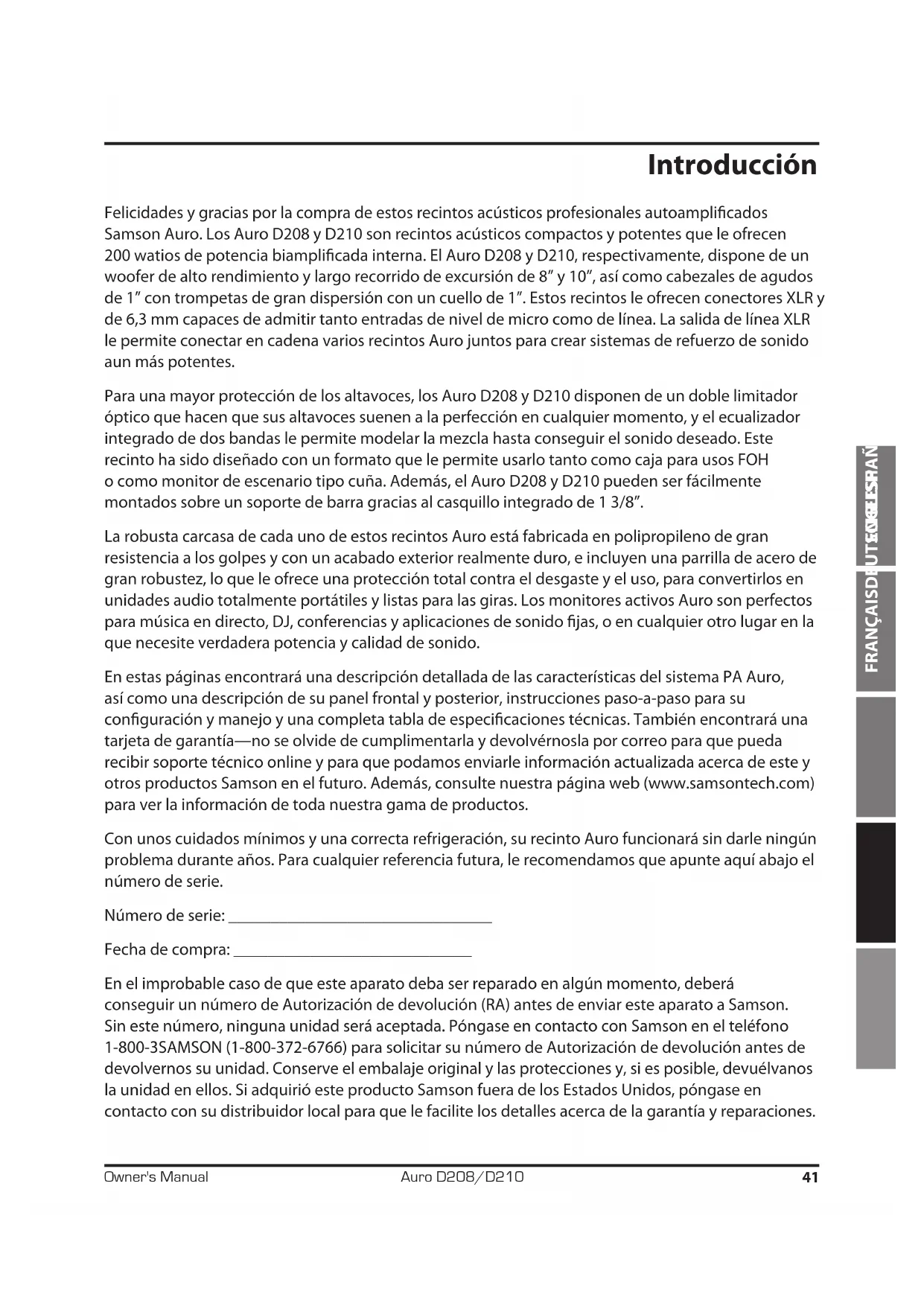 En estas páginasas encontrará una descripción detallada de las característica del sistema PA Auro, como una descripción de su panel frontal y posterior, instrucciones paso-a-paso para su configuración y manejo y una completenessa tabla de specifications痫icas. Internacionalearrarauna tarjeta de garantía—no se olvide de complimentarla y devolvénosla por correo para que pueda recibir soporte的技术ico online y para que podamos enviarle informacionactualiza acerca de este yculos productsos Samson en el futuro. Además, consulte notrestra网页 (www.samsontech.com) para ver la informacion de toda notrestra gama de productos.